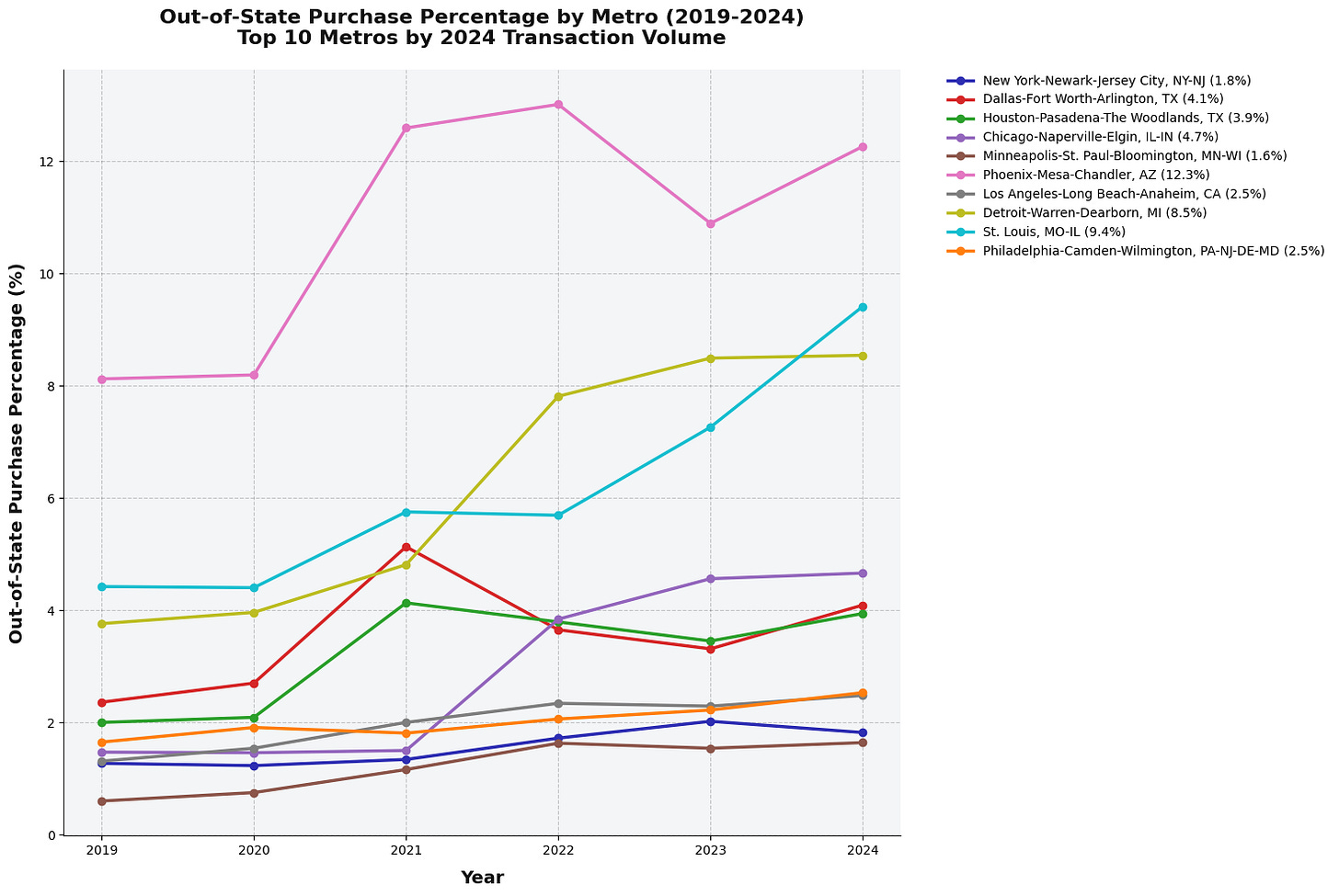 Among the top 10 metropolitan areas by transaction volume, out-of-state investment rates vary dramatically. Phoenix leads with 12.3% of purchases coming from out-of-state buyers, while Minneapolis shows the lowest rate at 1.6% - a more than sevenfold difference between the highest and lowest markets.