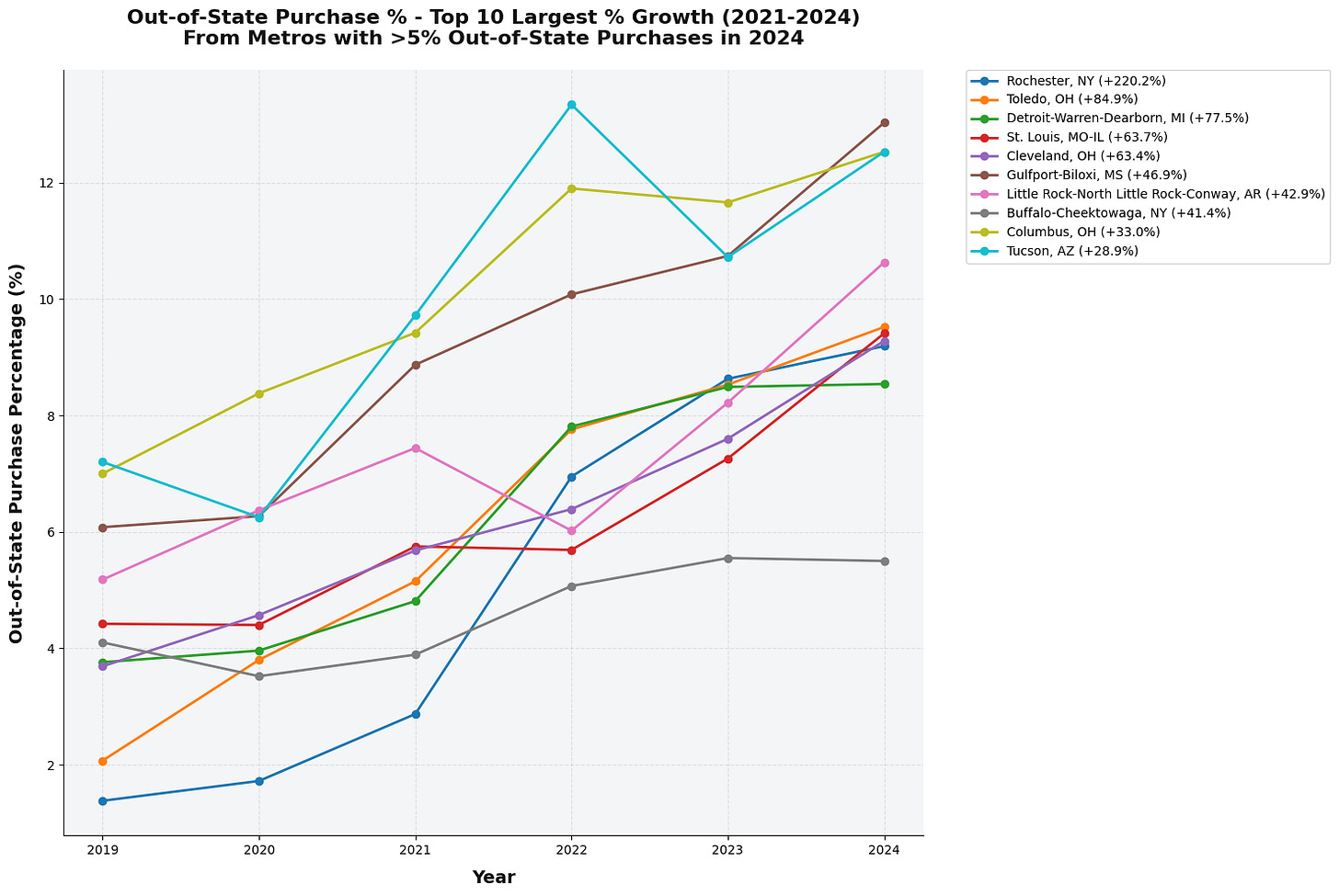 Rust Belt metropolitan areas demonstrate the strongest growth in out-of-state investment activity. Rochester leads this trend with a 220% increase in non-local purchases, exemplifying a broader shift in investor interest toward traditionally industrial markets.