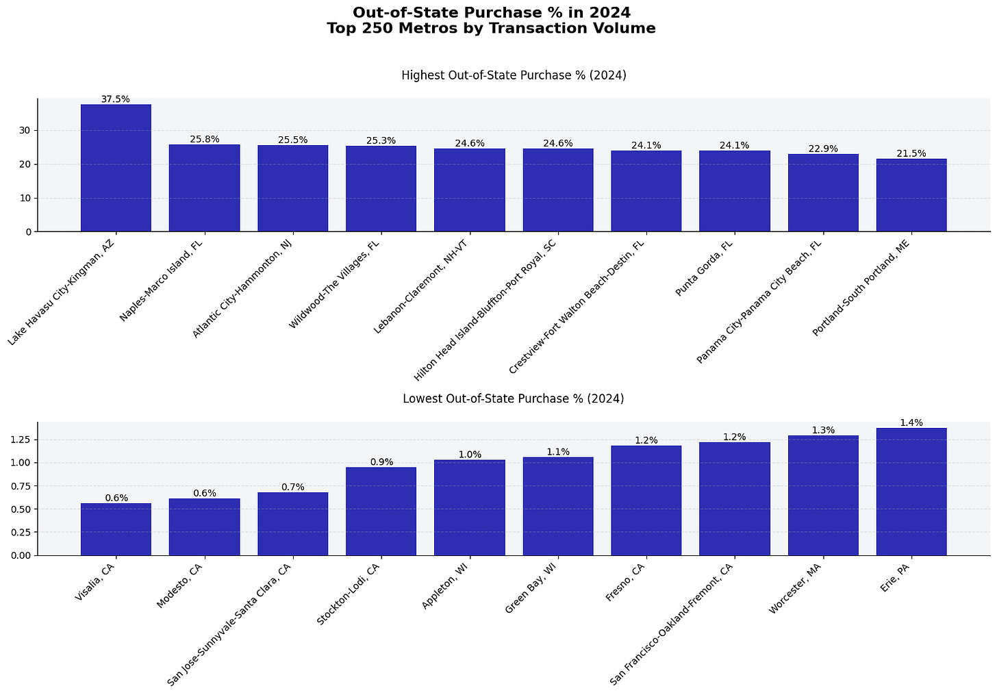 Leisure markets demonstrate the highest concentration of out-of-state purchases in 2024, led by Florida and other vacation destinations. Lake Havasu exemplifies this trend, with non-local buyers accounting for more than one-third of residential transactions. Conversely, California's Central Valley and Wisconsin markets show the lowest rates of out-of-state investment, reflecting stronger local buyer presence in these regions.