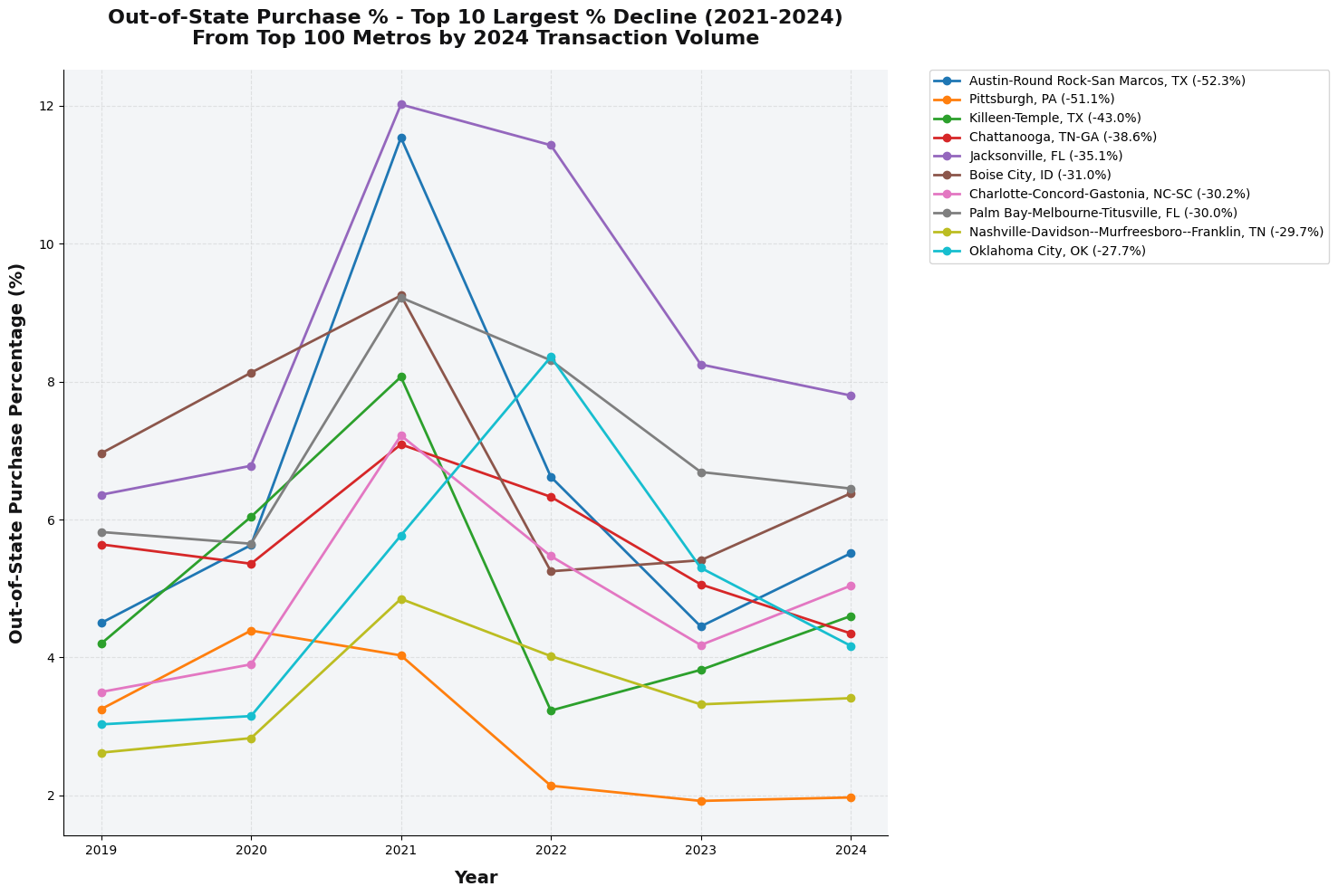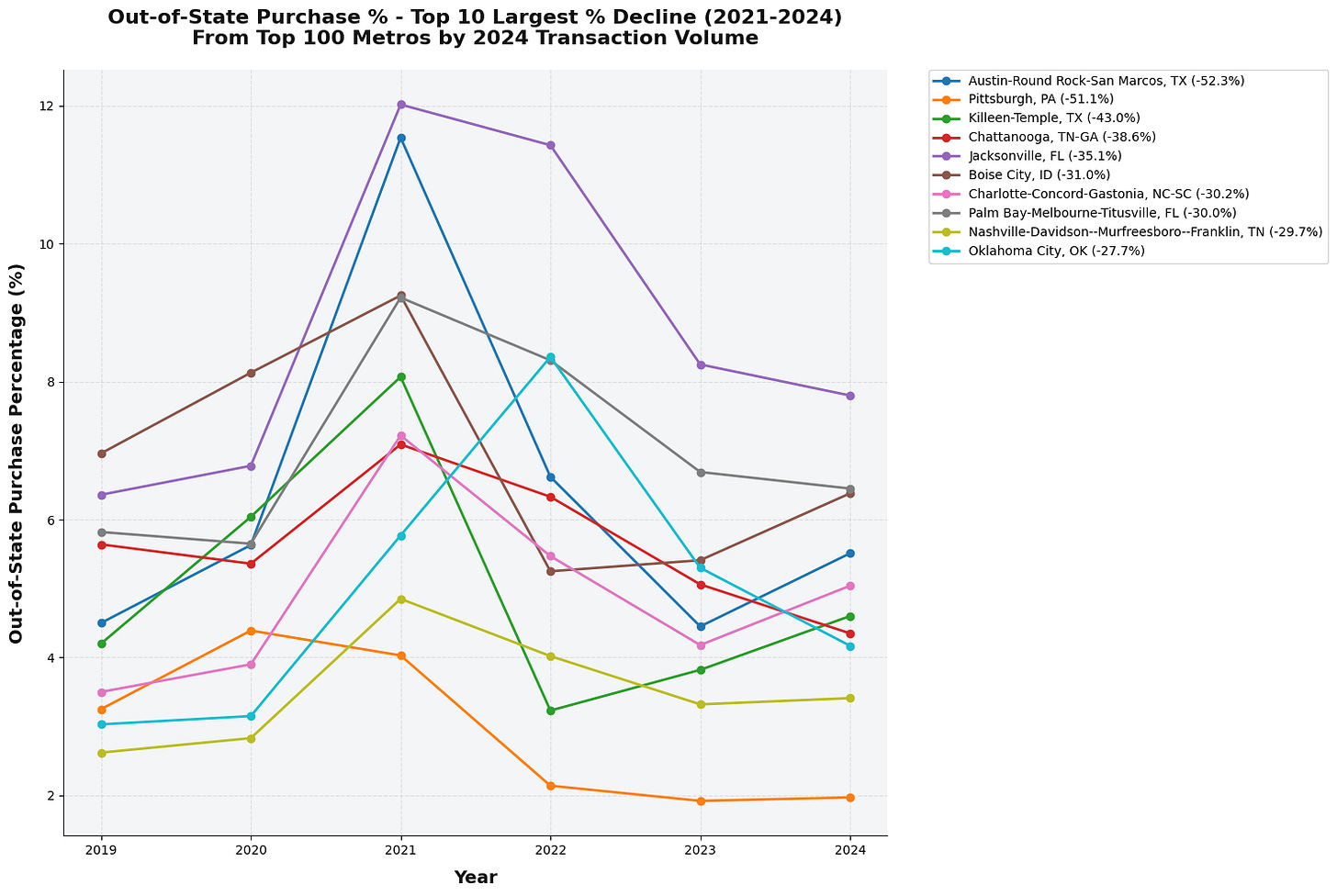 Austin experienced the most significant decline in out-of-state investment activity, coinciding with the market's position as the national leader in rental price decreases. This shift appears connected to changing investment patterns, particularly among West Coast investors who previously viewed Austin as an expansion market but have since scaled back their portfolio growth in the region.