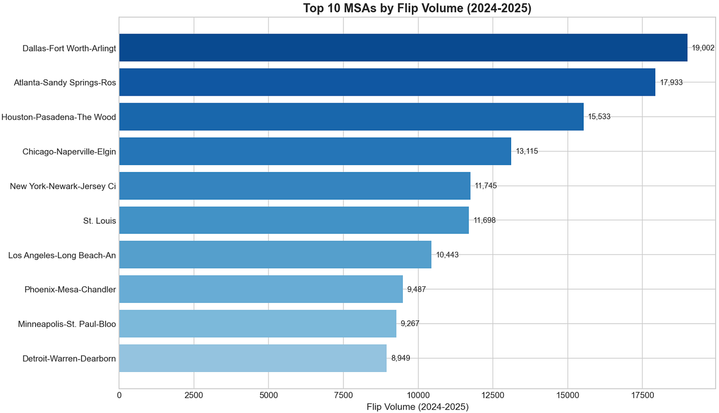 There's been considerable geographic diversity in flip activity for the past two years. While Texas has 2 of the top 3 metros, we see representation from the Southeast, Midwest, both coasts, and the Southwest among the top 10 MSAs with the most flips.