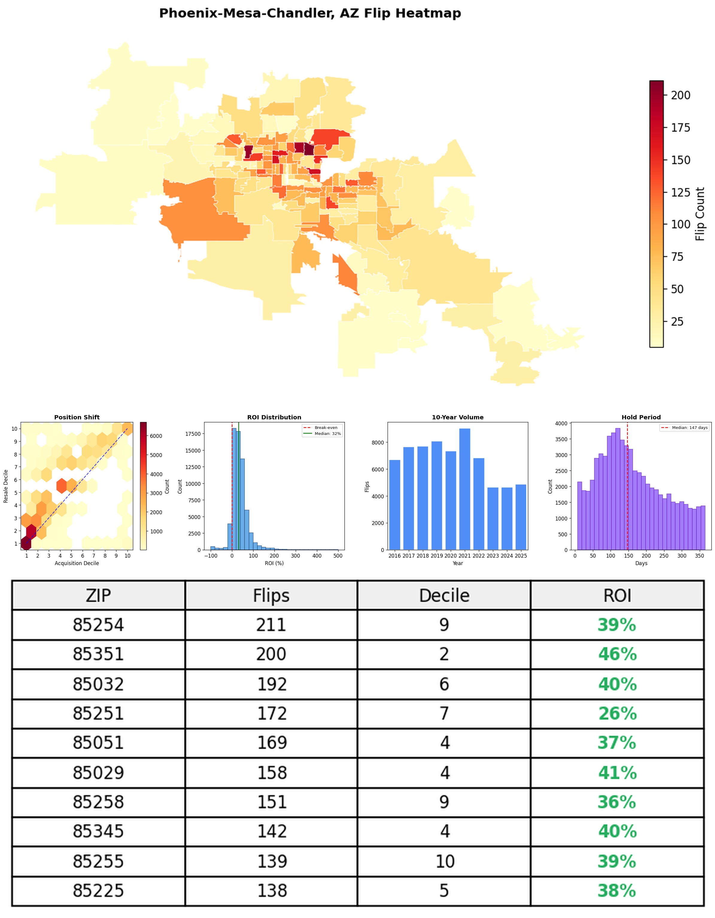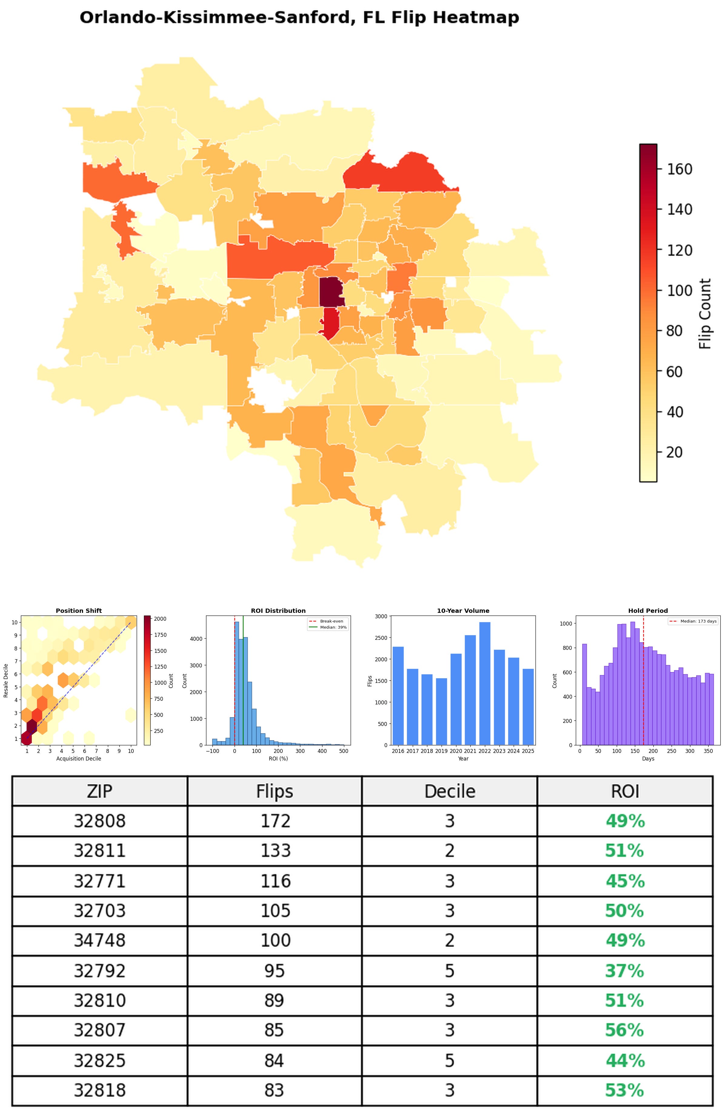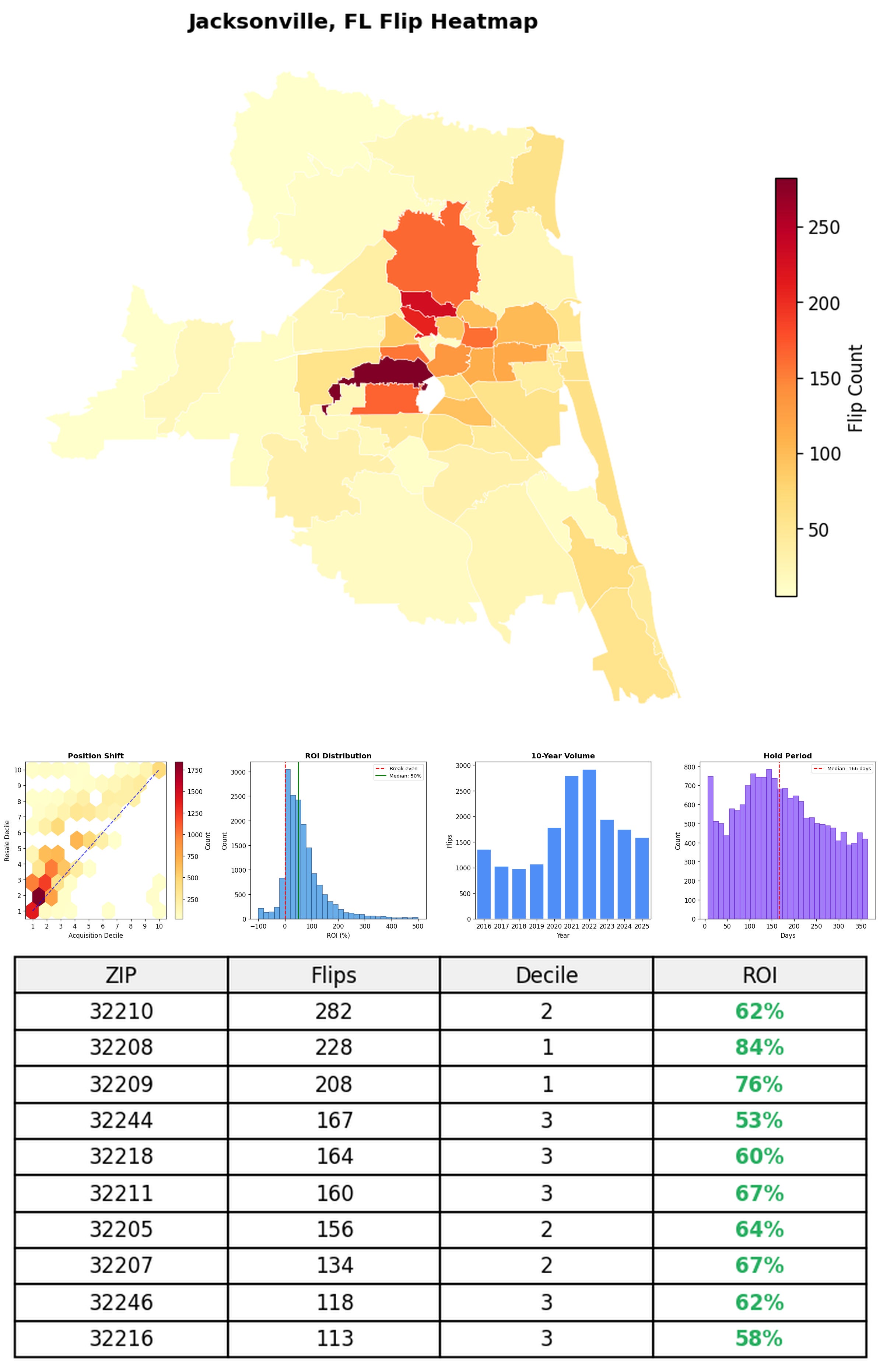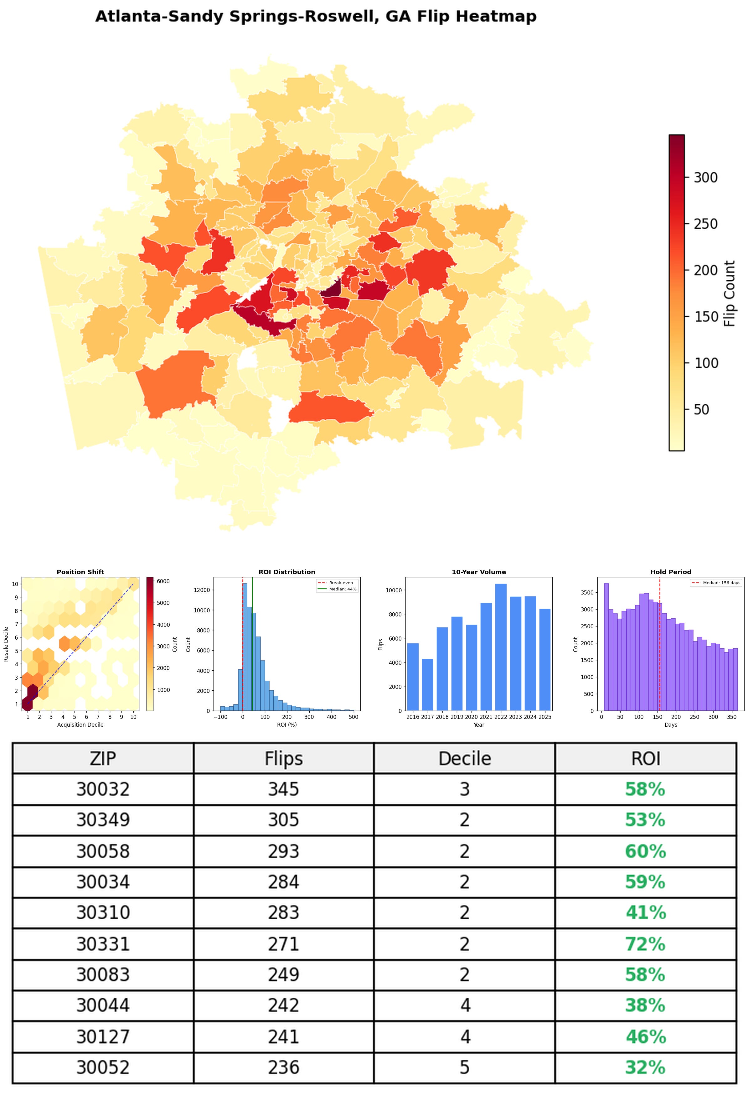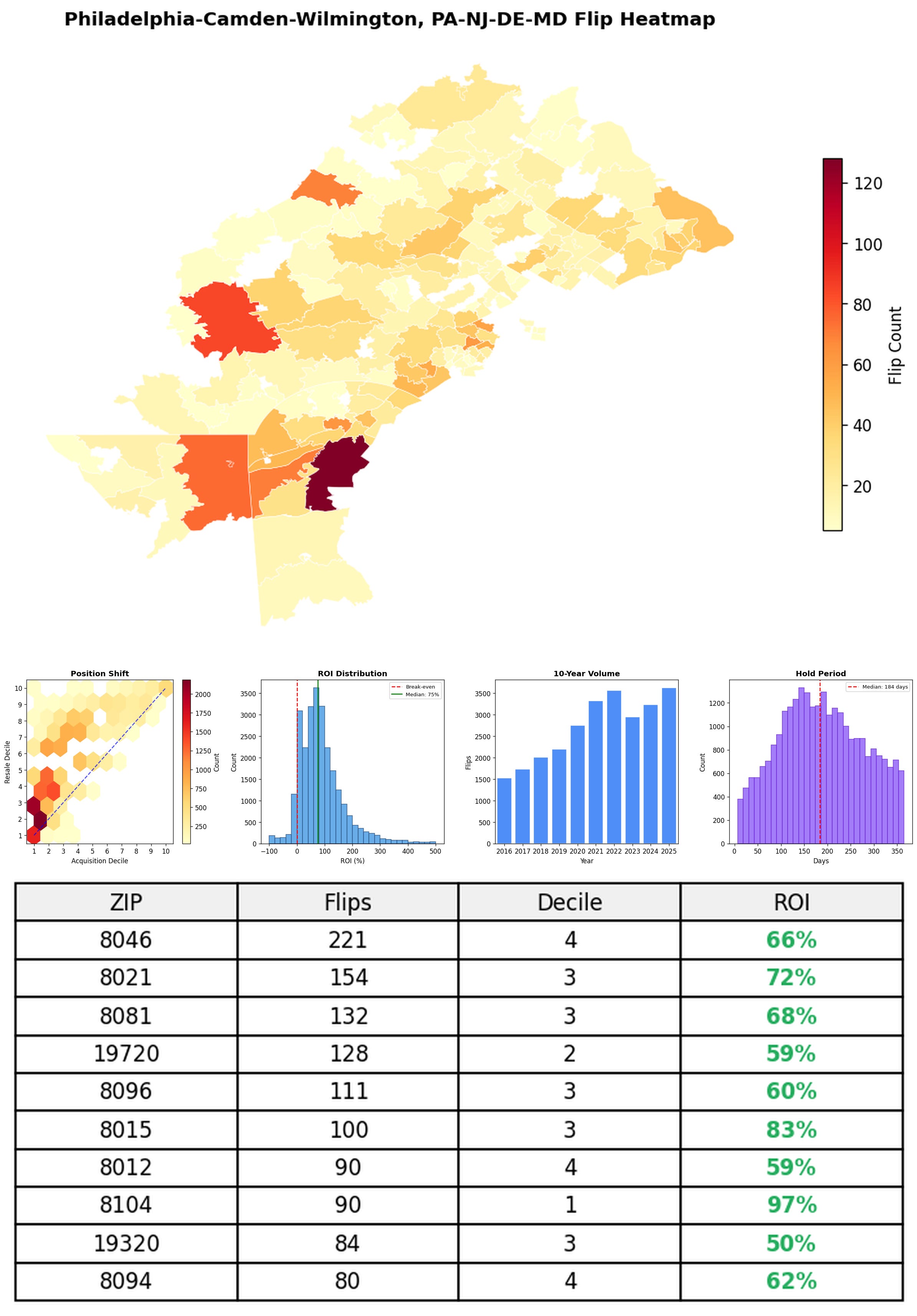 In the follow charts we break down the top 100 MSAs and show the top zips flips are happening, their hold times, ROI, acquisition volume over their last decade and more.