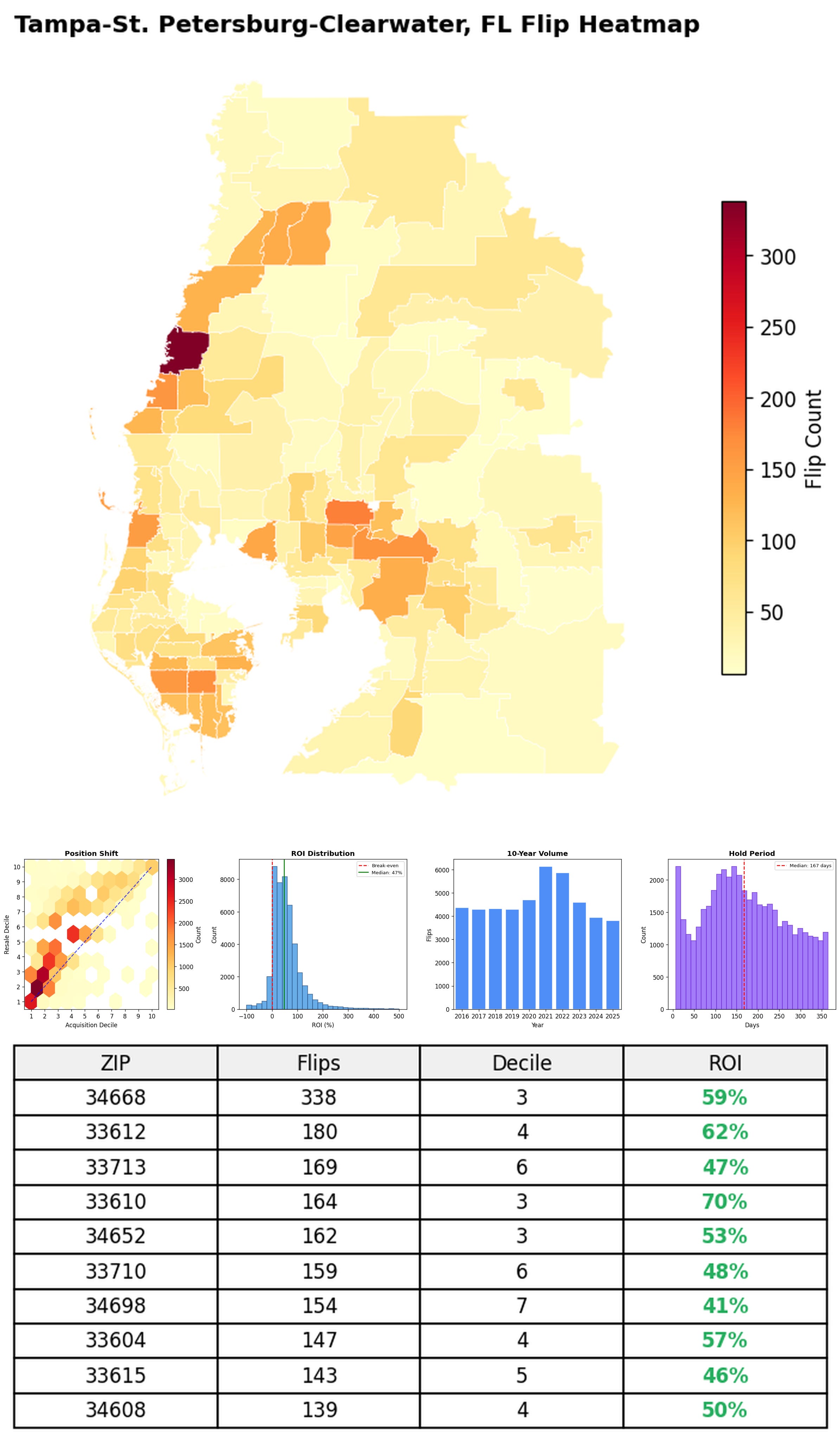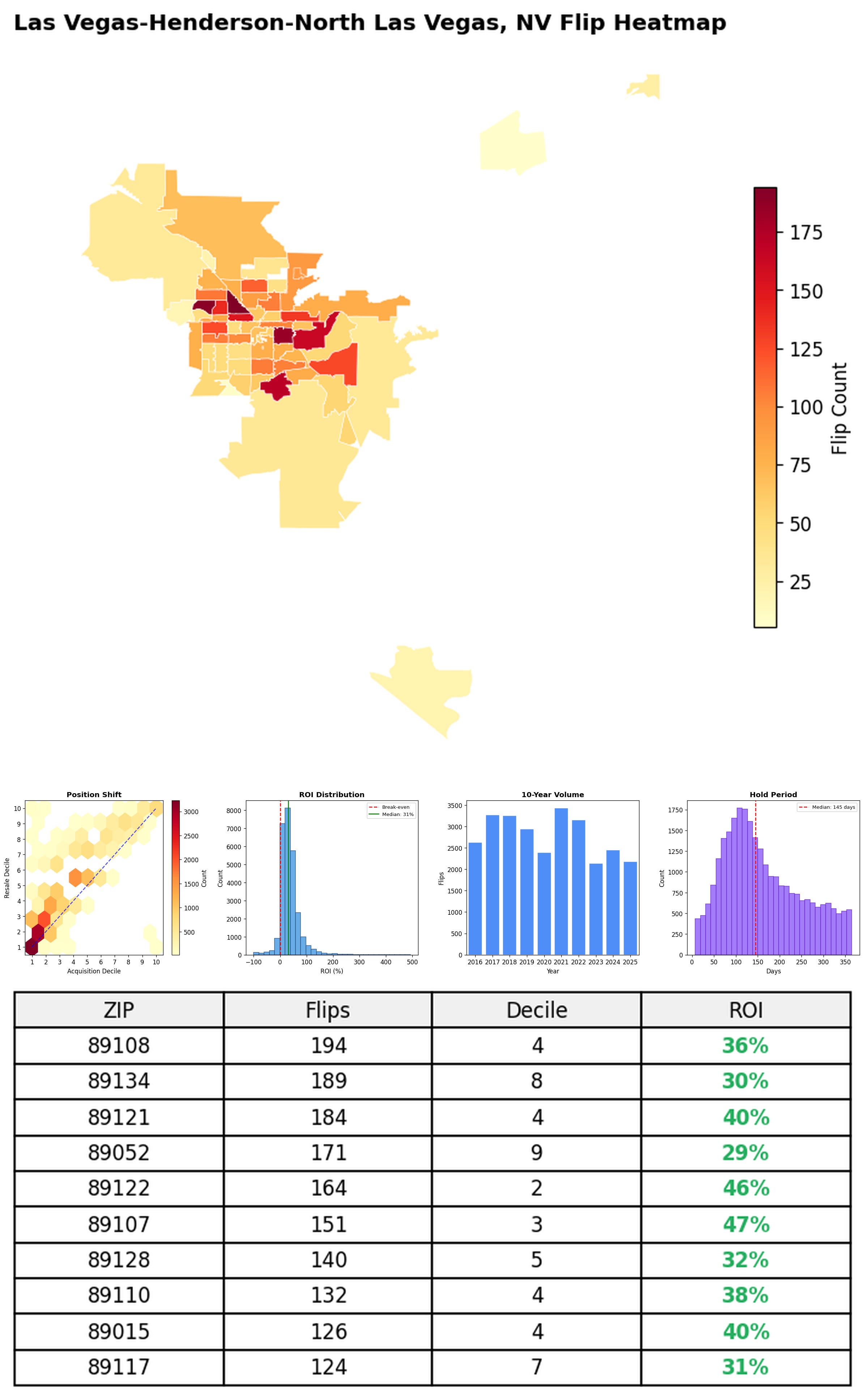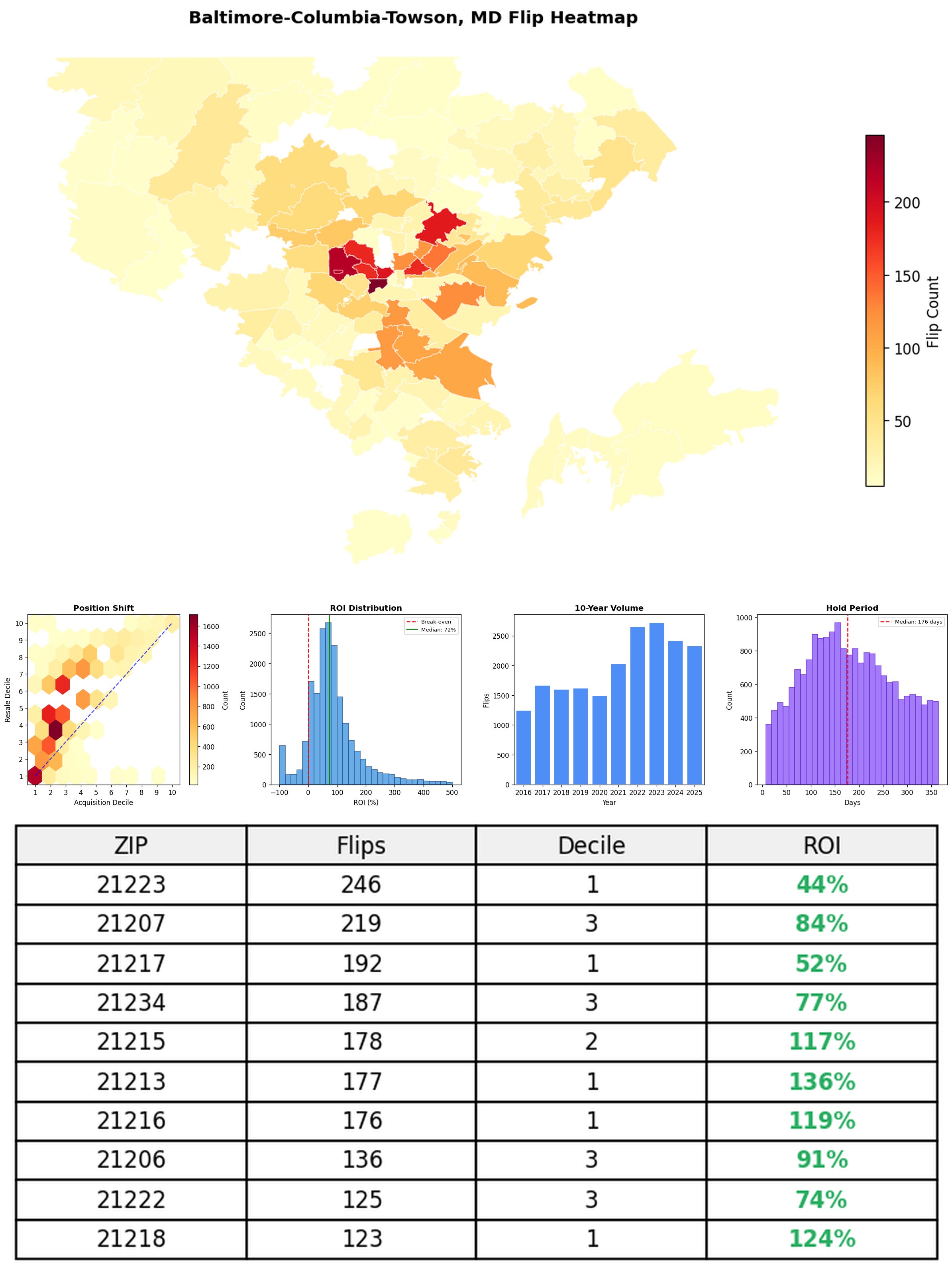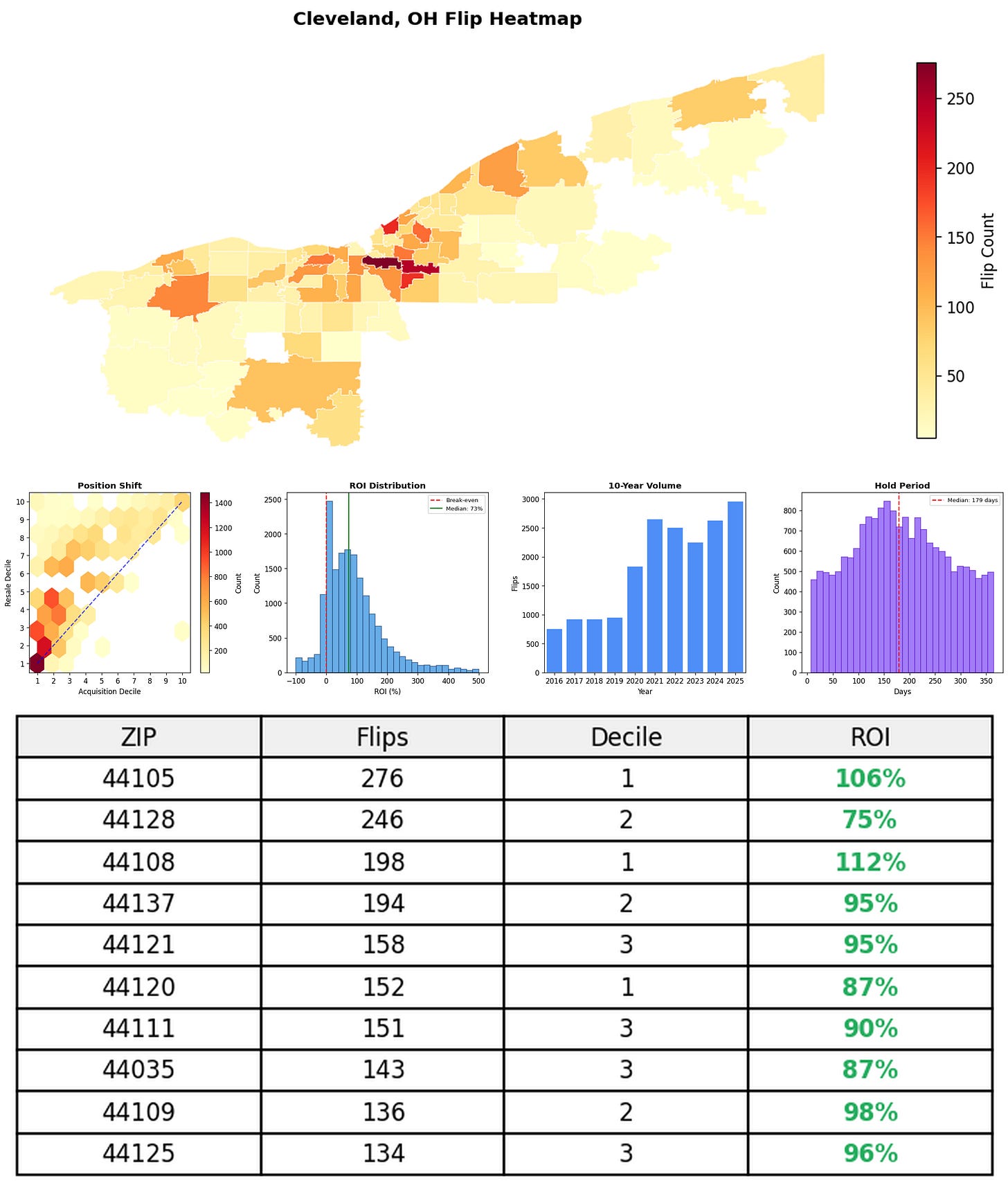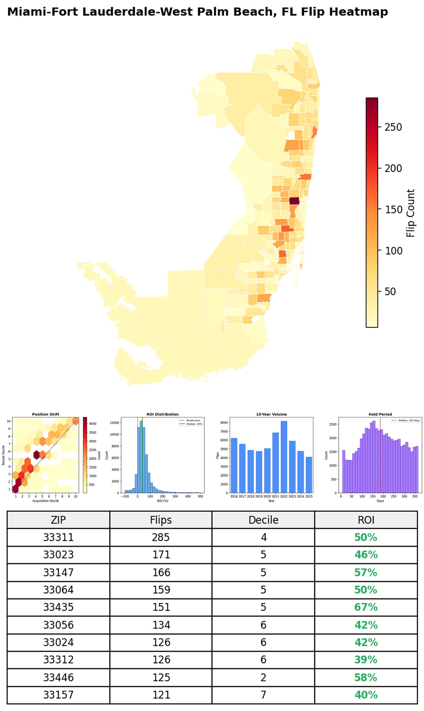 In the follow charts we break down the top 100 MSAs and show the top zips flips are happening, their hold times, ROI, acquisition volume over their last decade and more.
