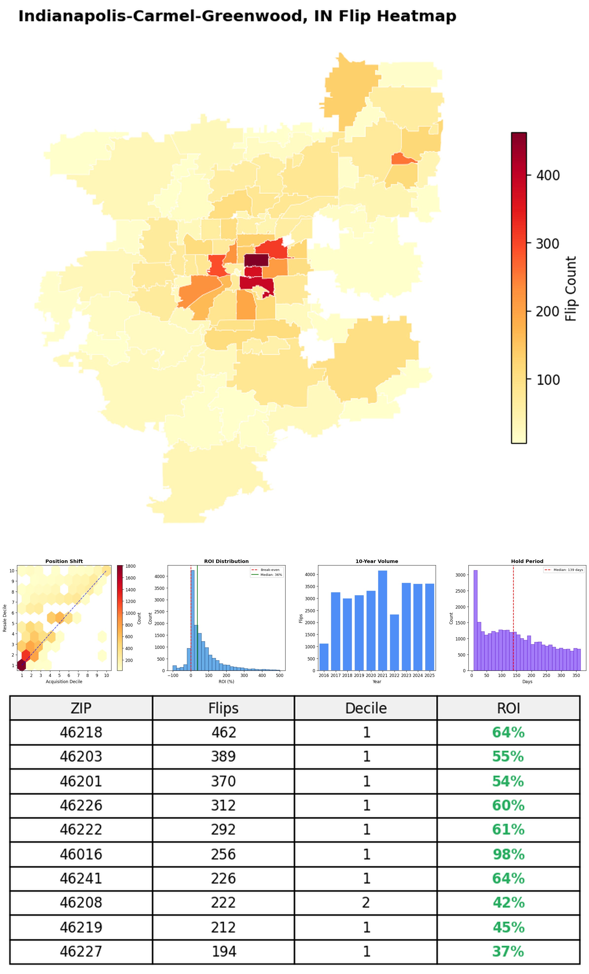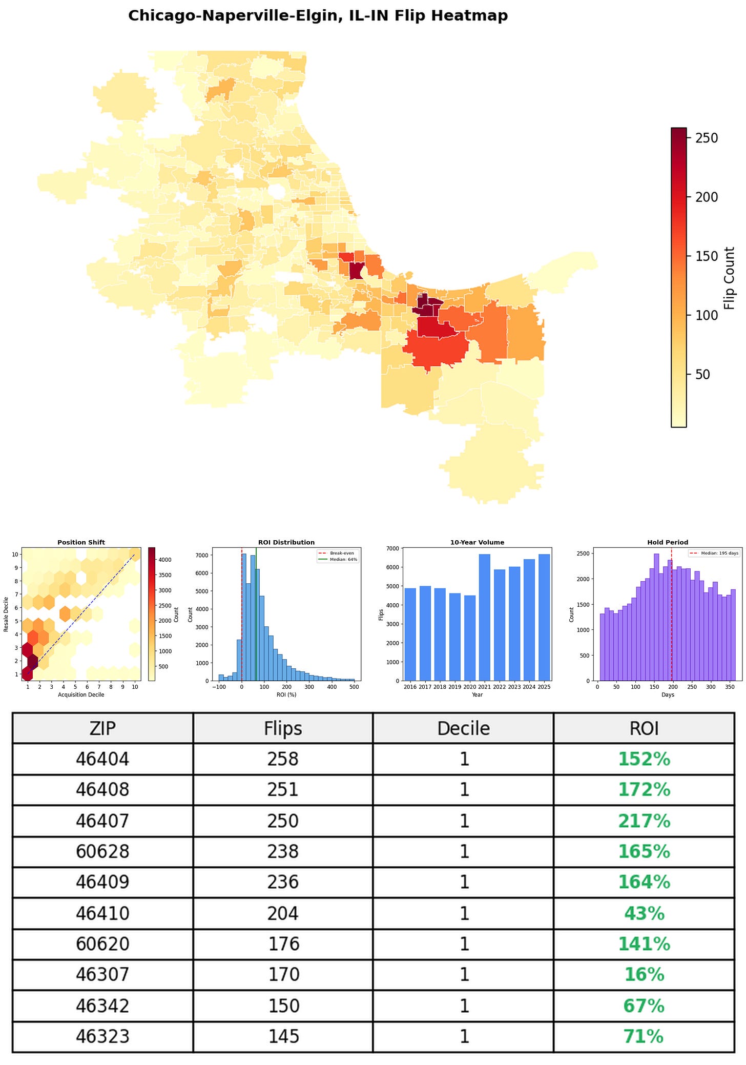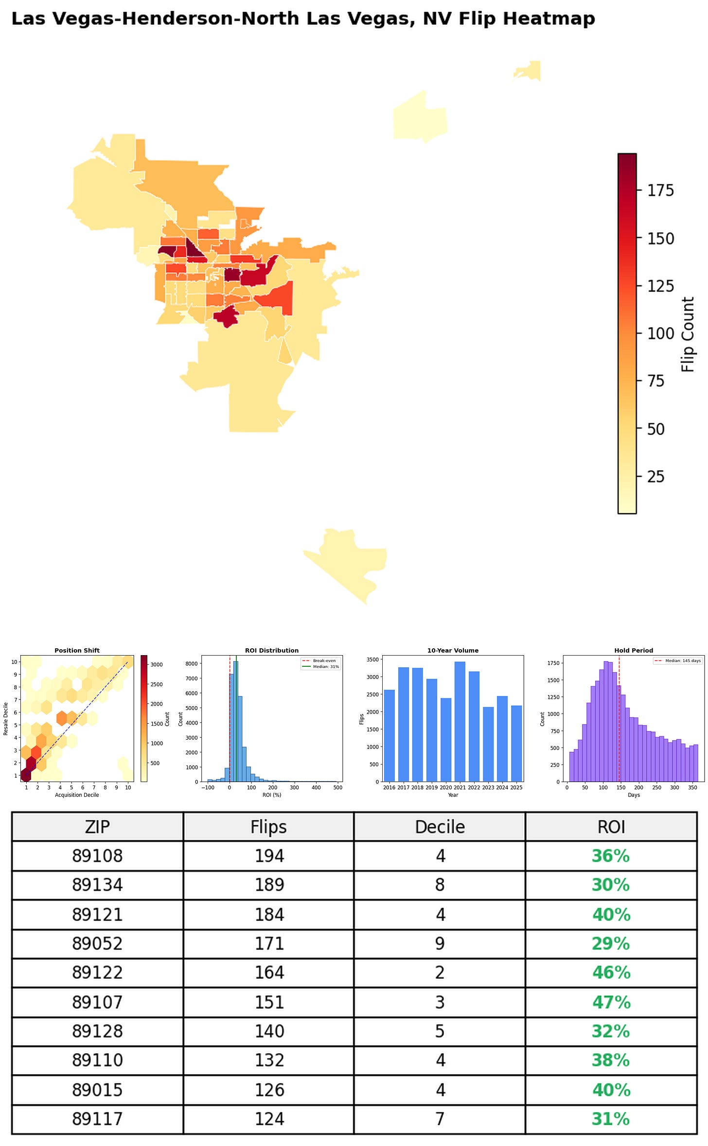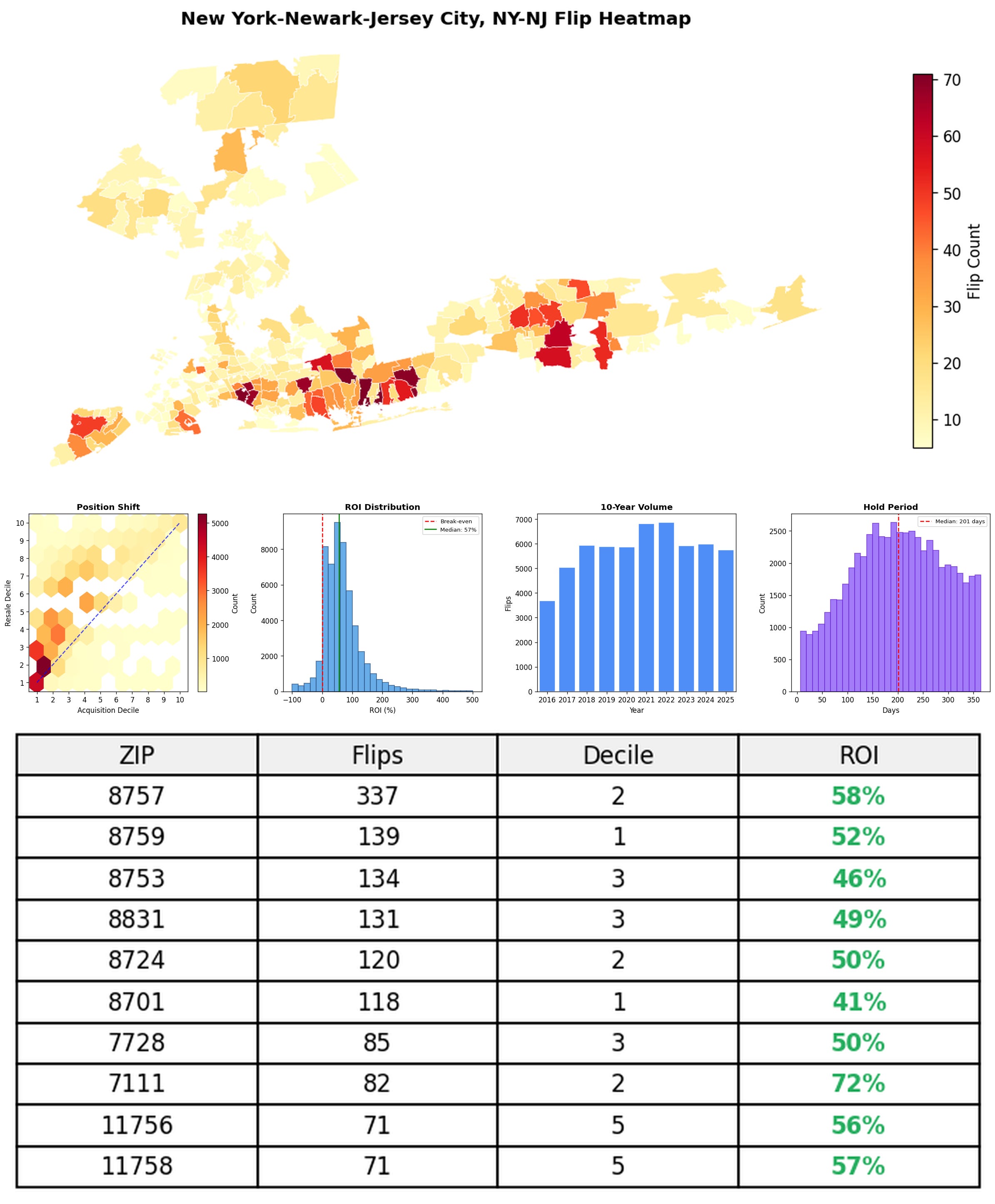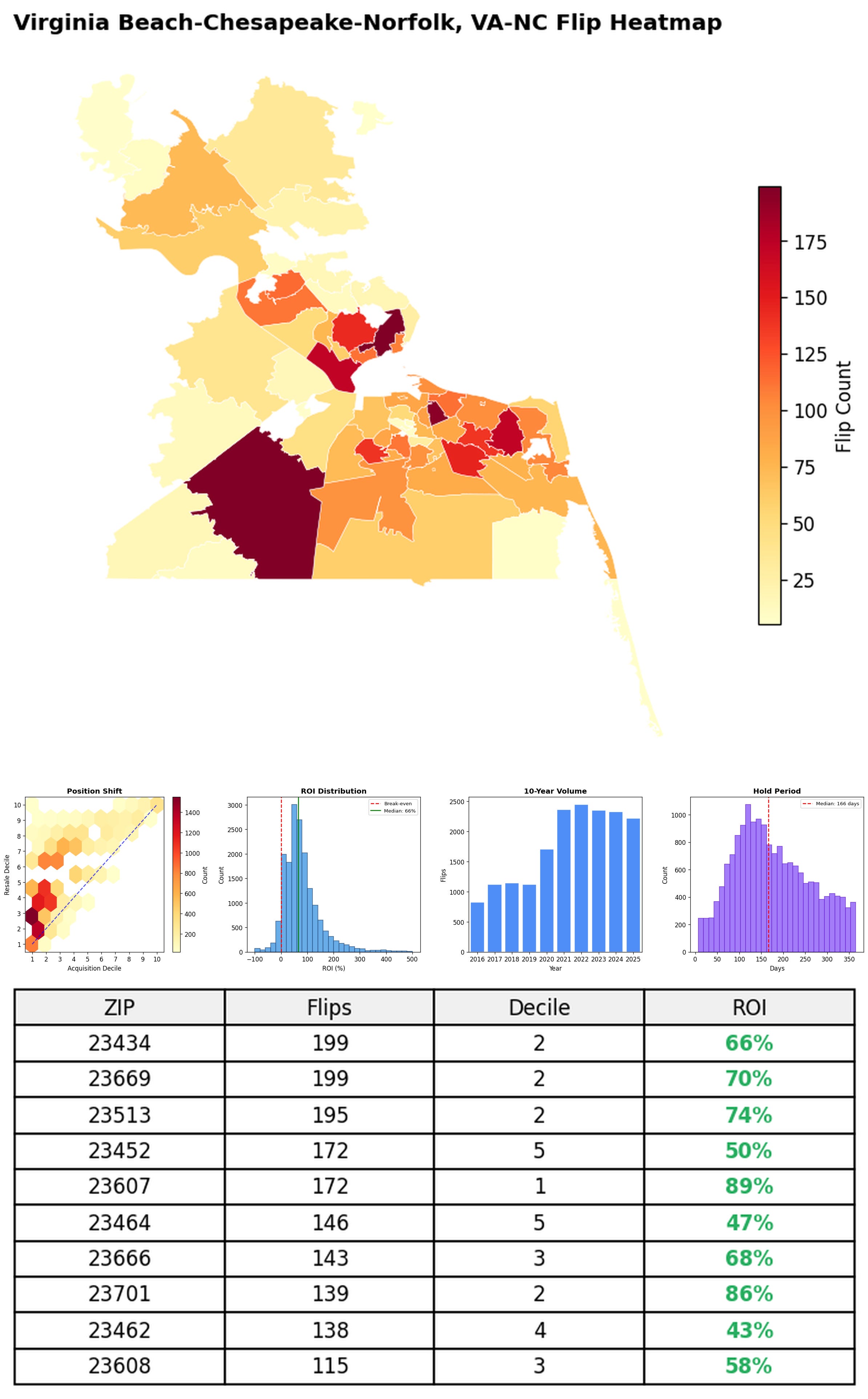 In the follow charts we break down the top 100 MSAs and show the top zips flips are happening, their hold times, ROI, acquisition volume over their last decade and more.