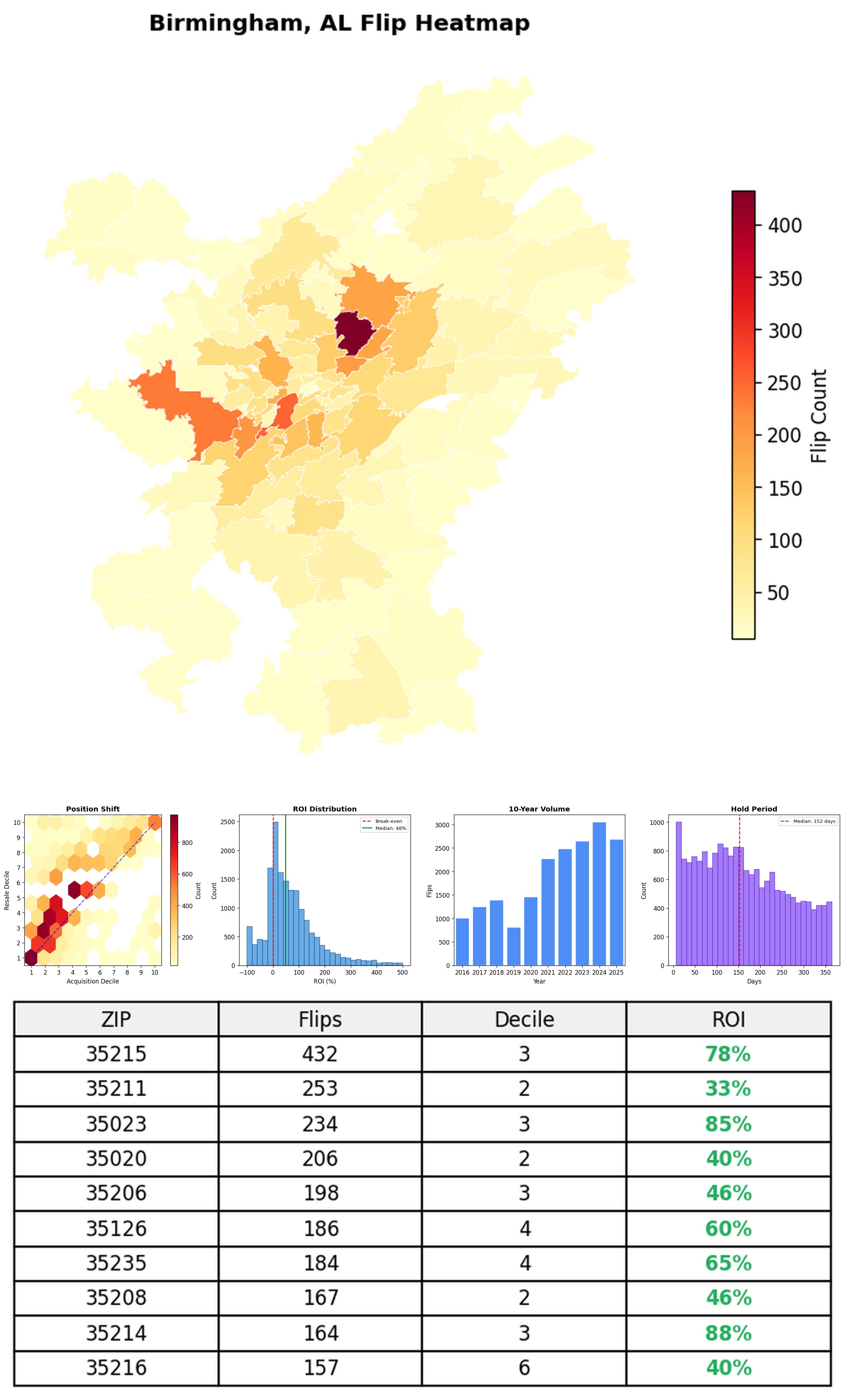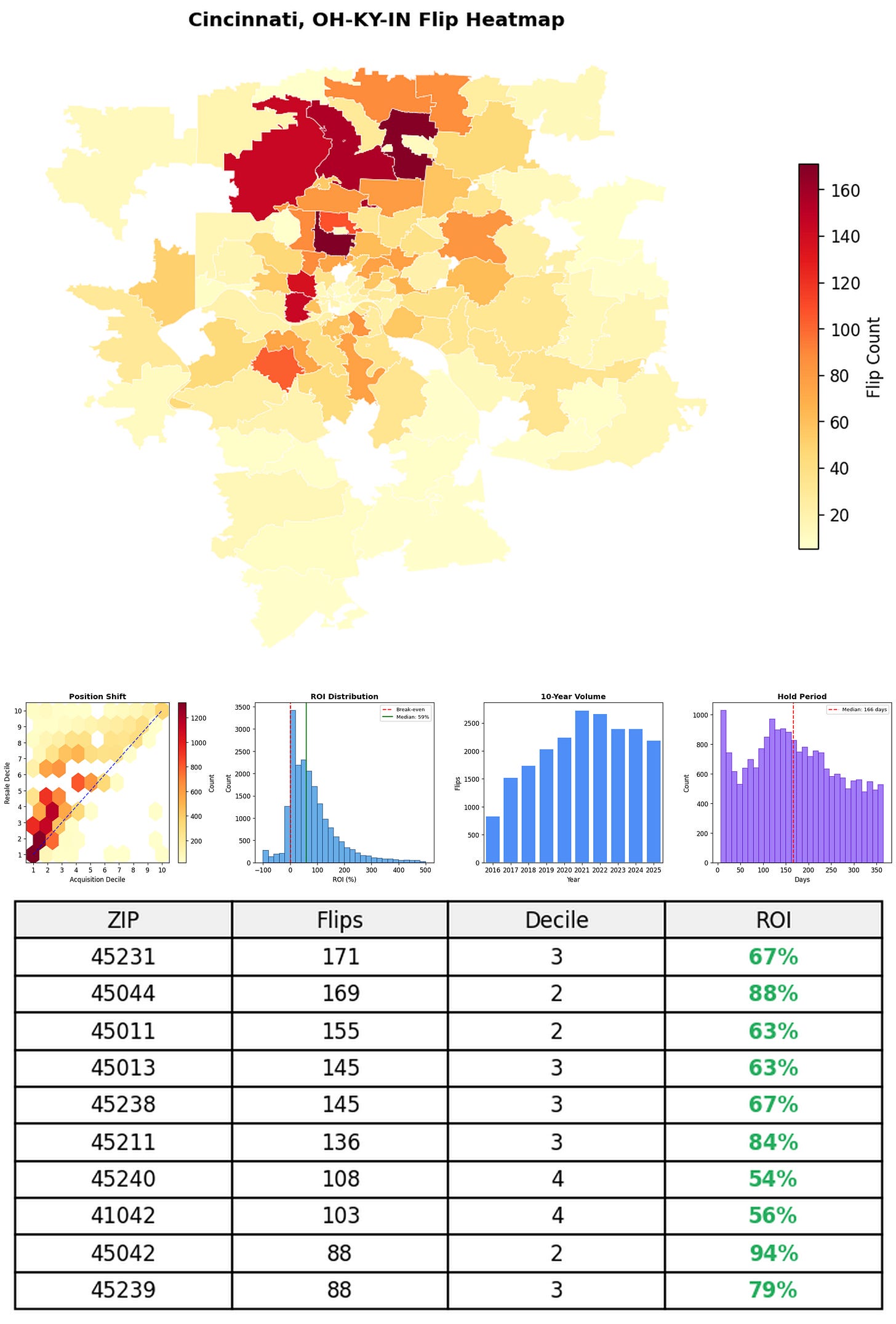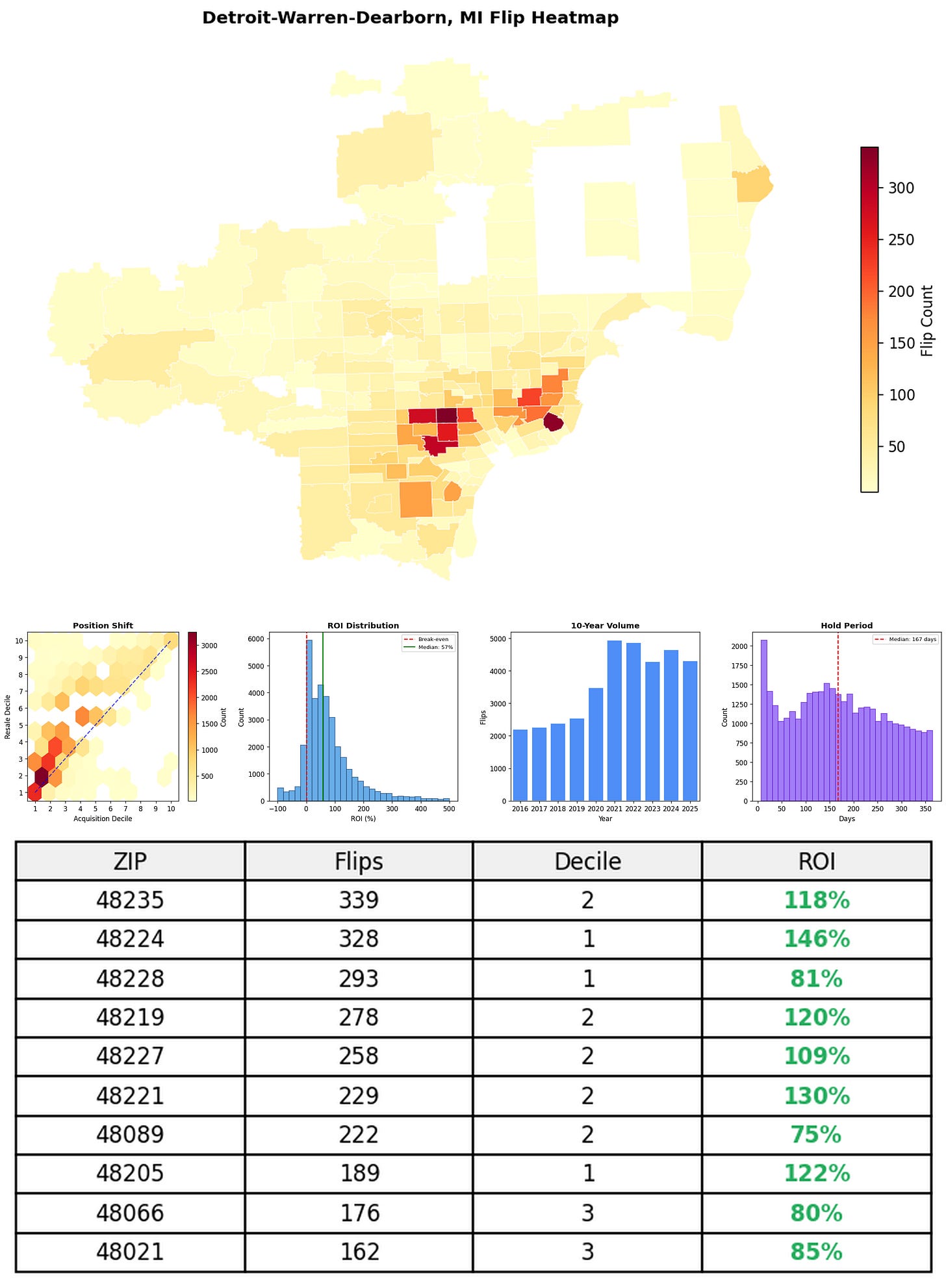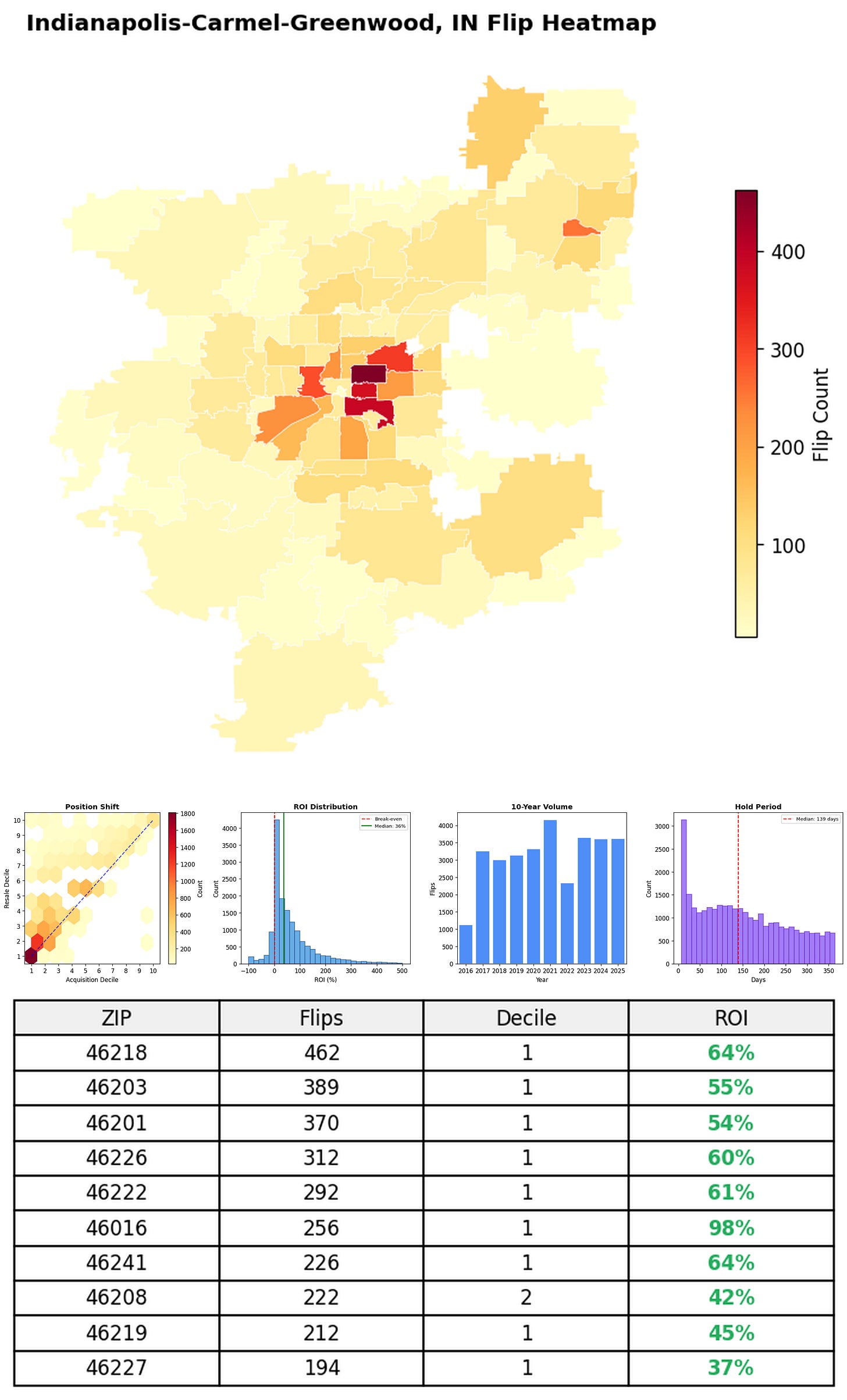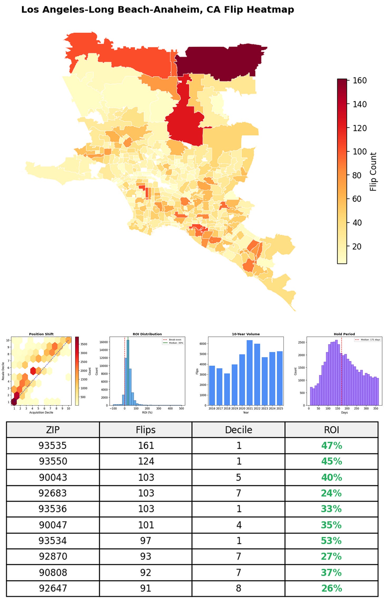 In the follow charts we break down the top 100 MSAs and show the top zips flips are happening, their hold times, ROI, acquisition volume over their last decade and more.