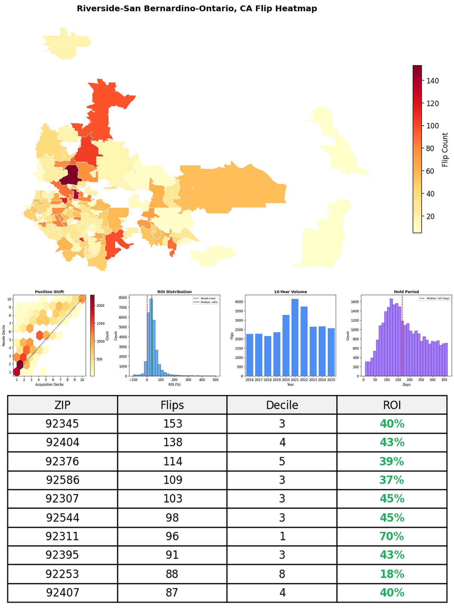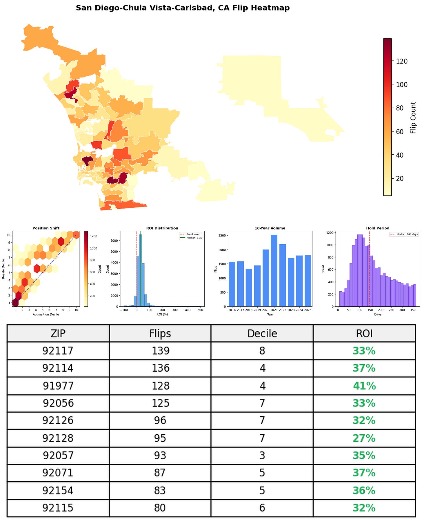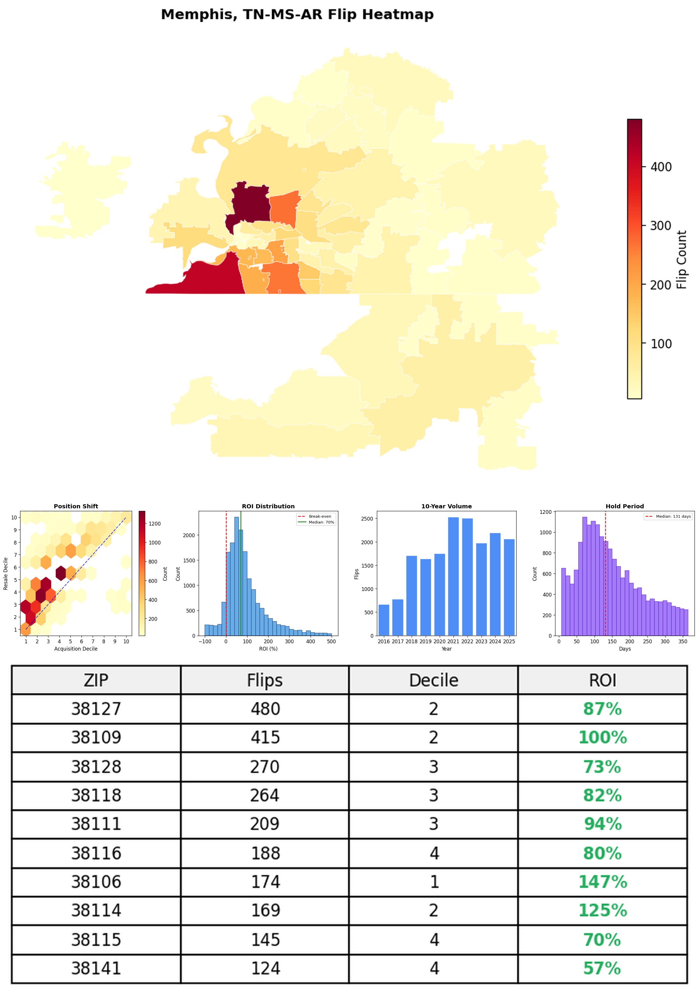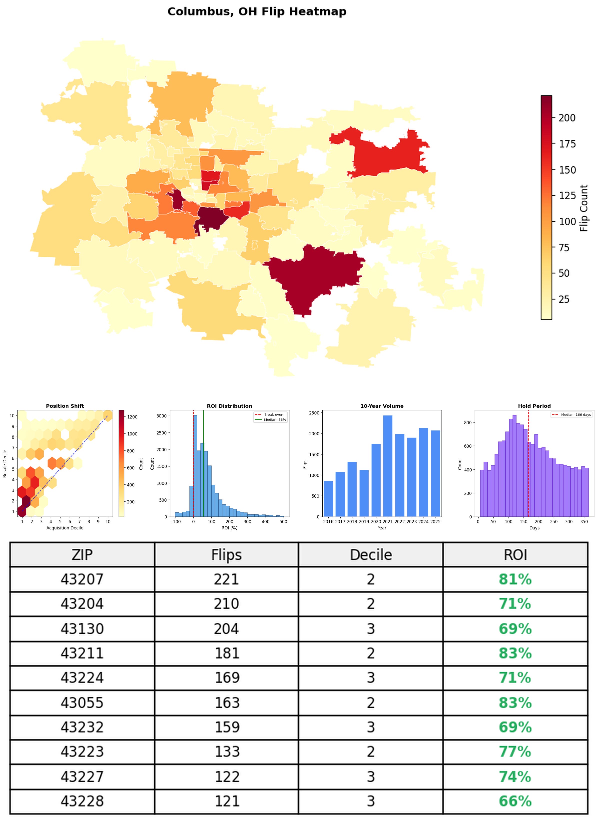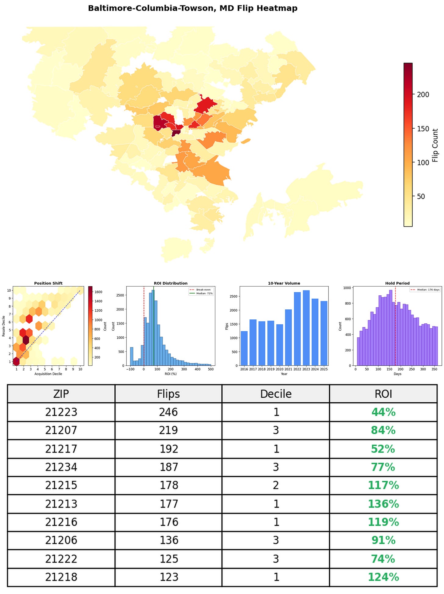 In the follow charts we break down the top 100 MSAs and show the top zips flips are happening, their hold times, ROI, acquisition volume over their last decade and more.