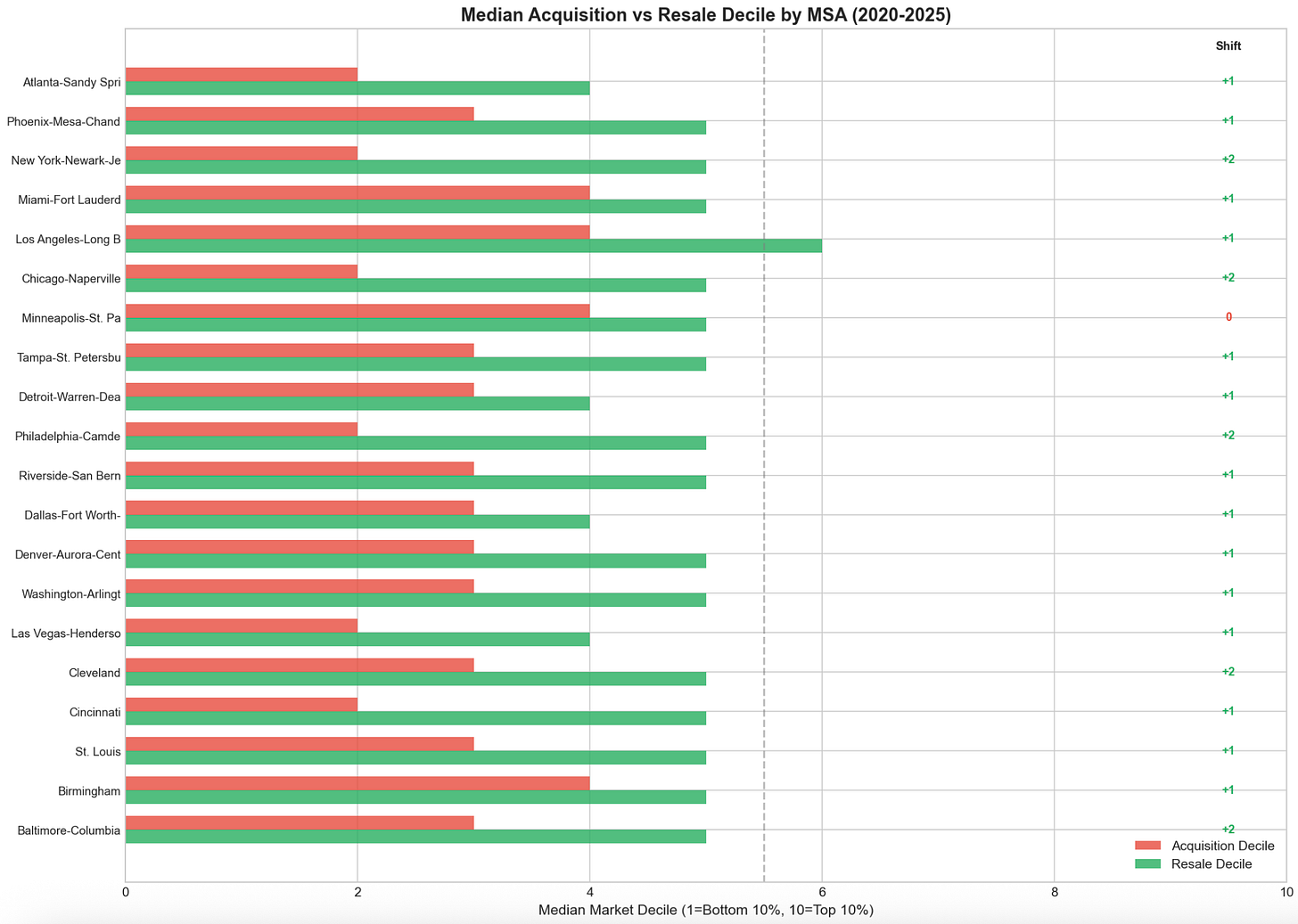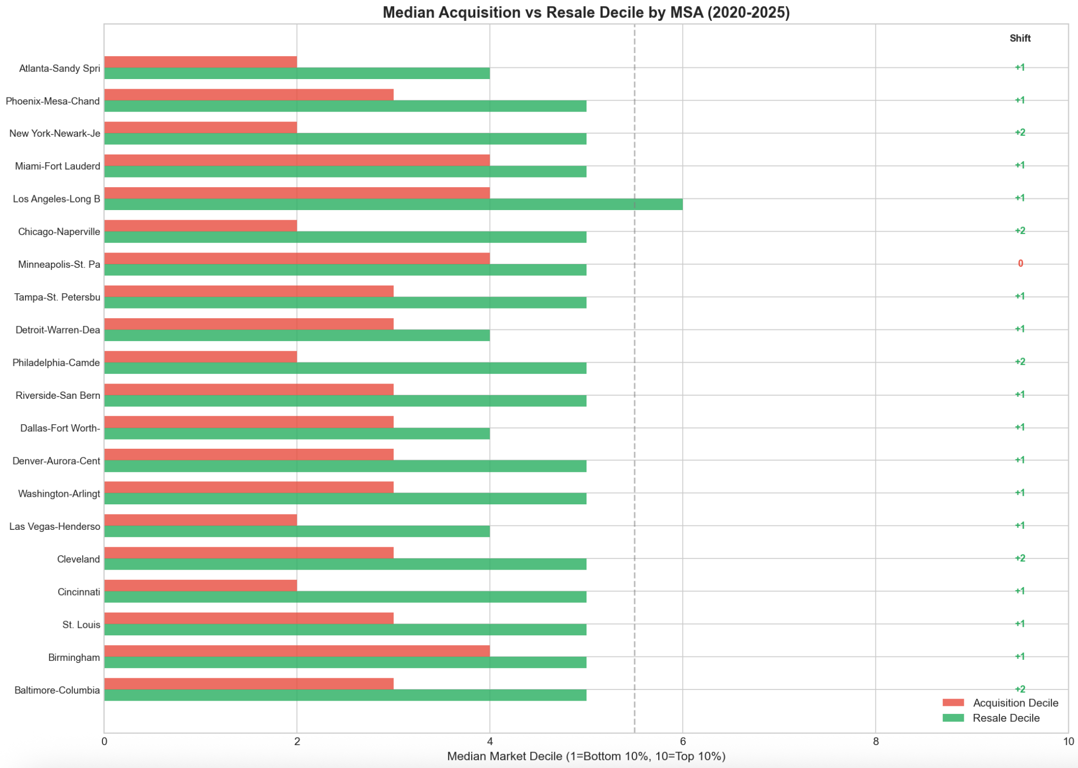Comparing acquisition to resale price percentiles, properties typically jump one to two deciles. A common pattern is buying in the 10-20th percentile for the MSA, and reselling it at the 40th-50th percentile. Flippers often buy damaged properties and renovate them to be mid-market properties.