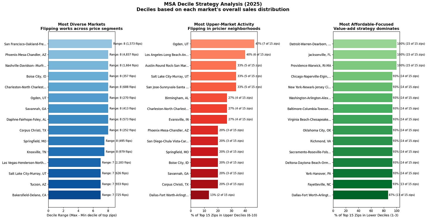 Flipper strategies vary dramatically by market. We compared the average acquisition price of a flip (at a ZIP code level) to the decile for the average home value in the MSA. We use this to see which markets have flip activity concentrated in lower-cost areas versus higher-cost ZIP codes.
