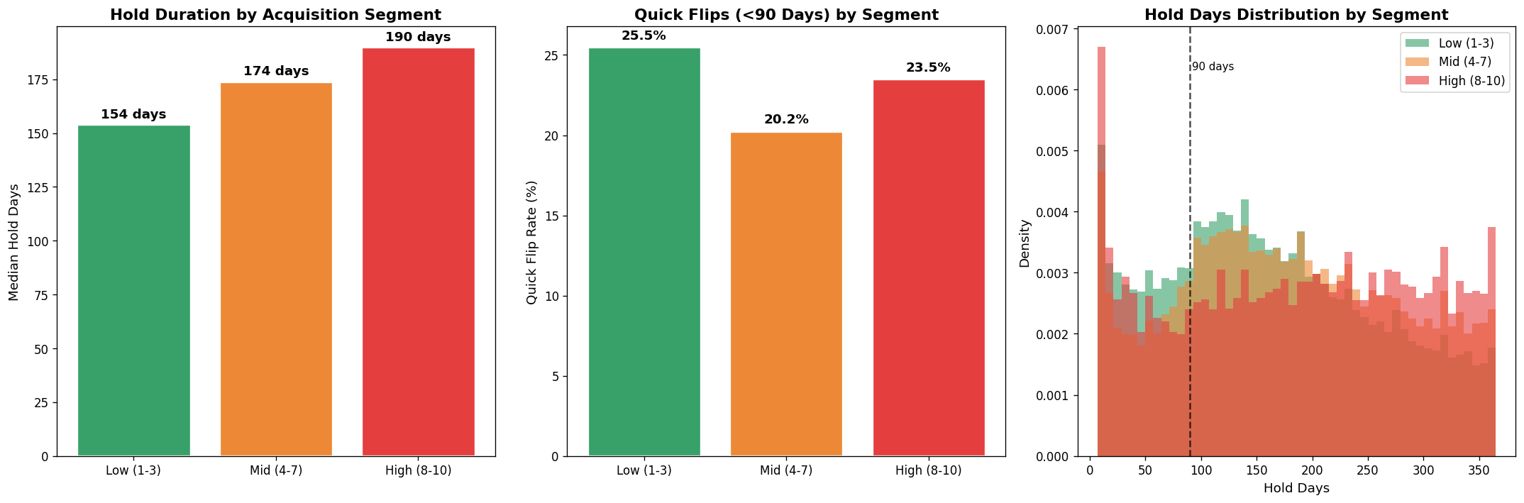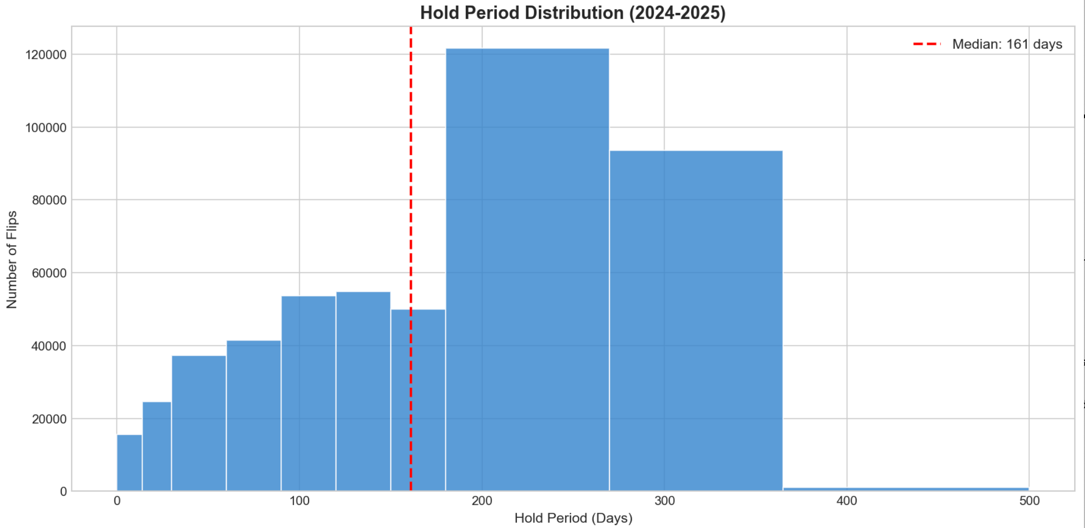 Flippers aim to minimize holding costs. The median hold time is 161 days.