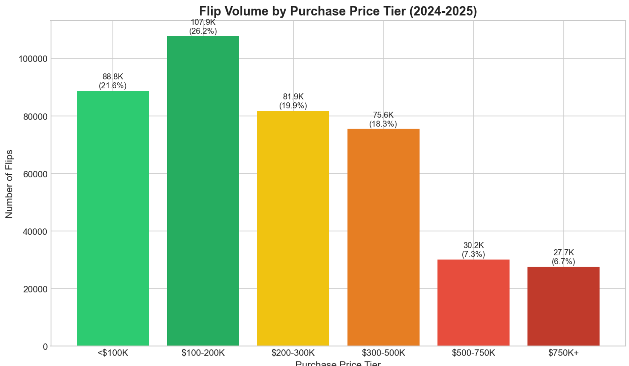 Below is the distribution by purchase price, showing the bulk of flipped properties bought below $300,000, but still sizable amounts bought above $500,000.