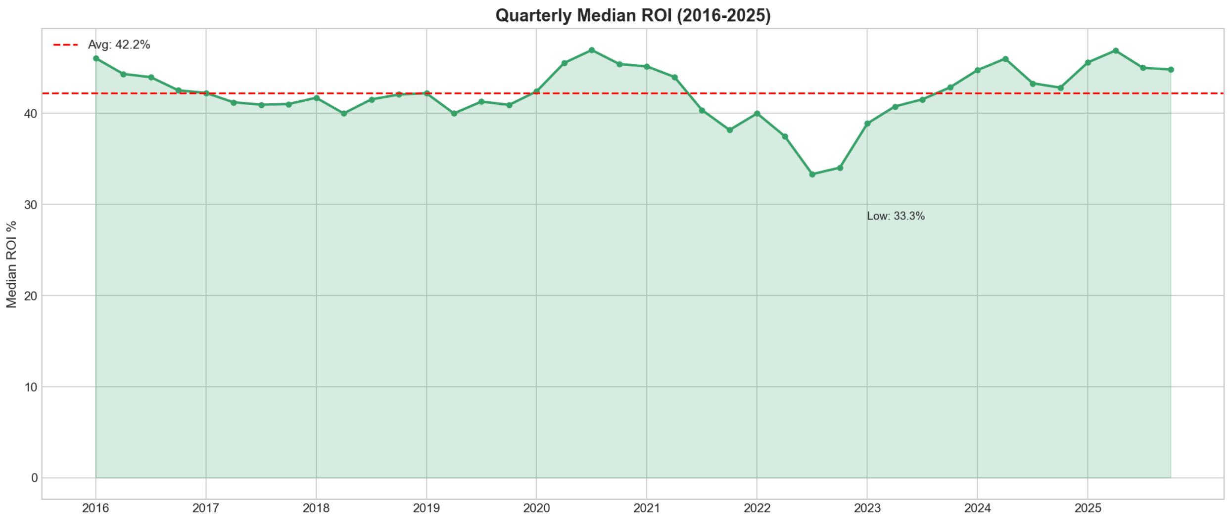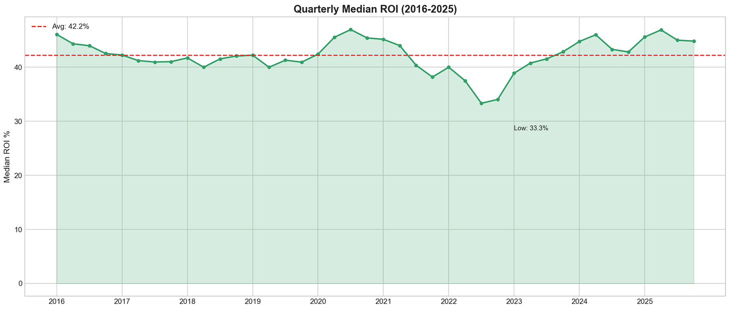 For ROI, we calculate gross return (resale price ÷ purchase price). Lower-cost metros tend to show higher ROI because fixed costs represent a larger share of each deal, requiring wider margins to be profitable.