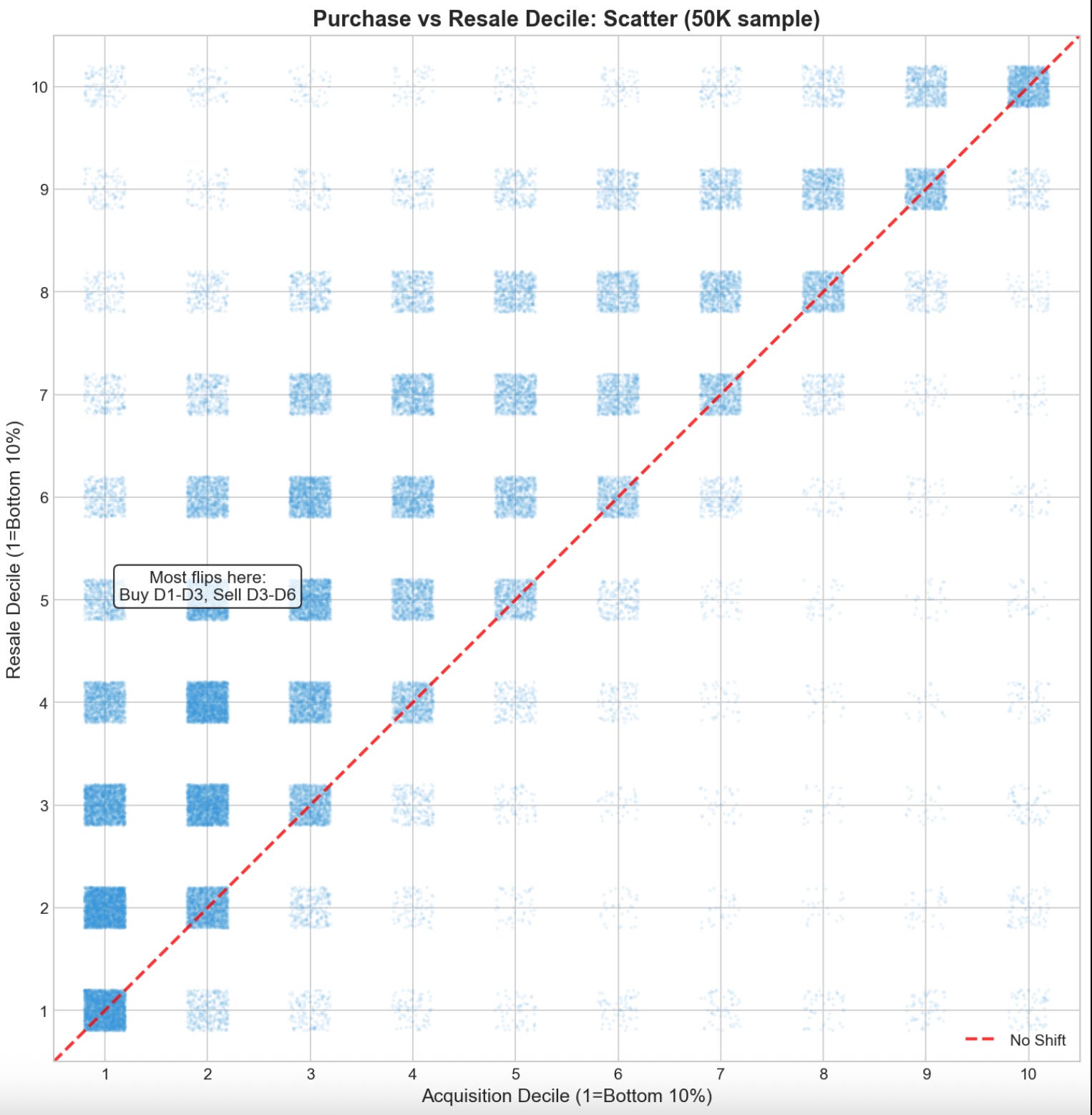 When aggregated nationwide, we can see this pattern clearly: the vast majority of flips are bought in the bottom 30% and resold in the top 50% of their local metro area.