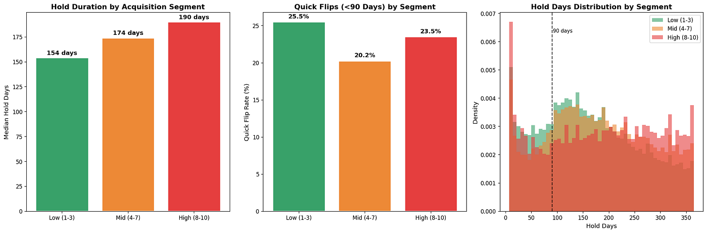 Higher acquisition prices correlate with longer hold times.