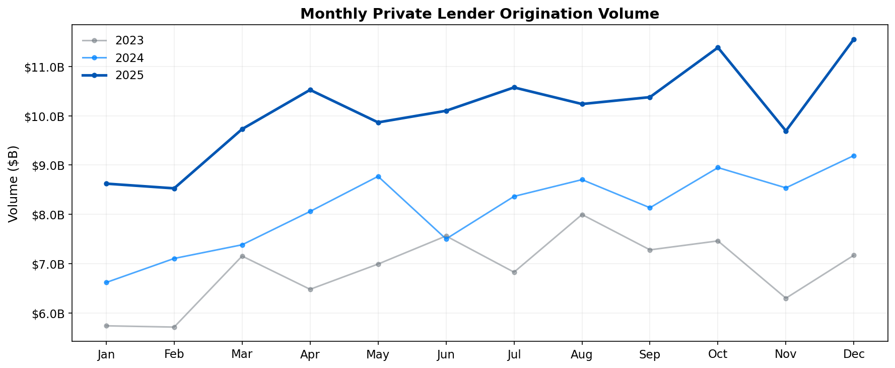 The total market is growing, up from $97.3B in 2024 to $121.2B in 2025, and the largest lenders are growing. 17 of the top 25 private lenders showed YoY growth. The top 50 lenders represented 56% of the origination volume