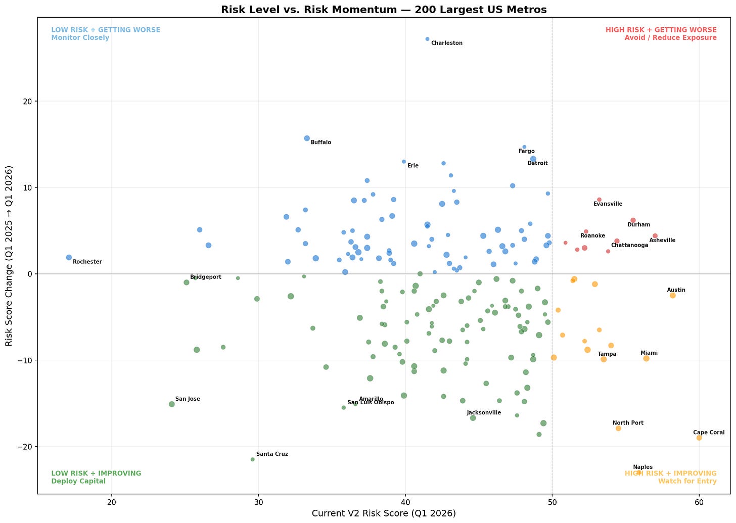 The higher the risk score, the more likelihood of price depreciation there is. Cape Coral, Naples, and North Port are all high, but have significantly improved YoY, while Asheville, Durham, and Chattanooga have all increased YoY and have relatively high scores.