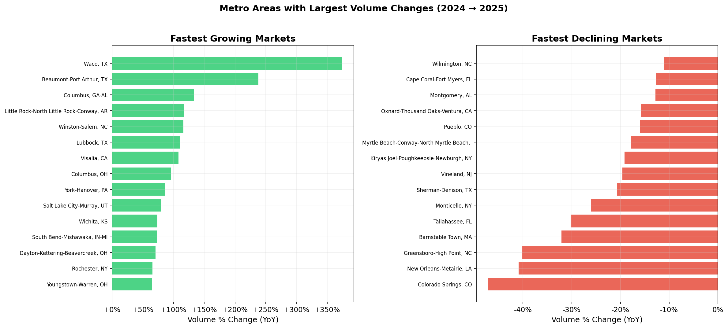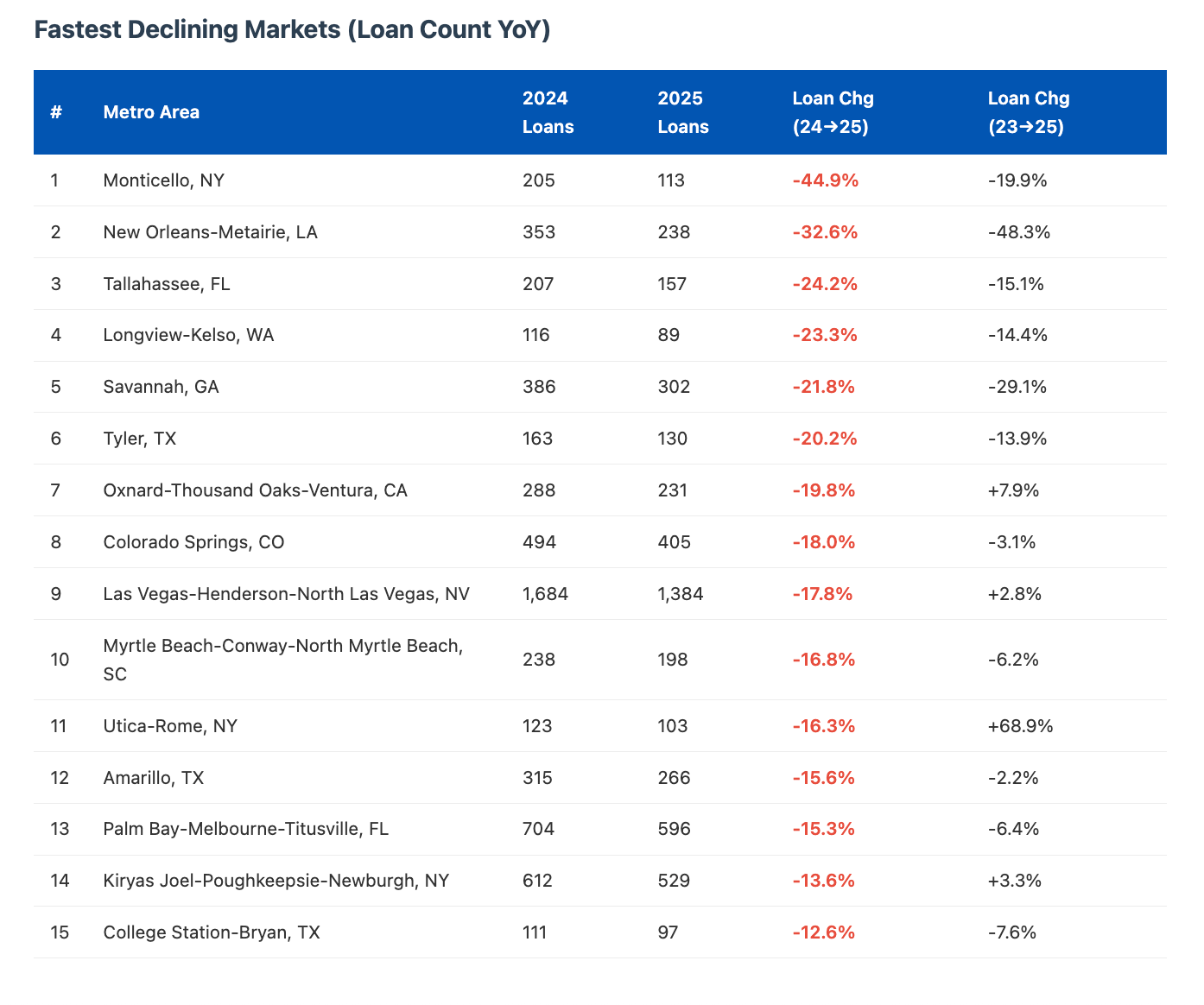 The vast majority of metro areas saw YoY increases in private lender activity. We prefer to look at loan count because loan volume in small metros can get noisy (for example a large portfolio refi in Waco skews the metrics in the second chart below).