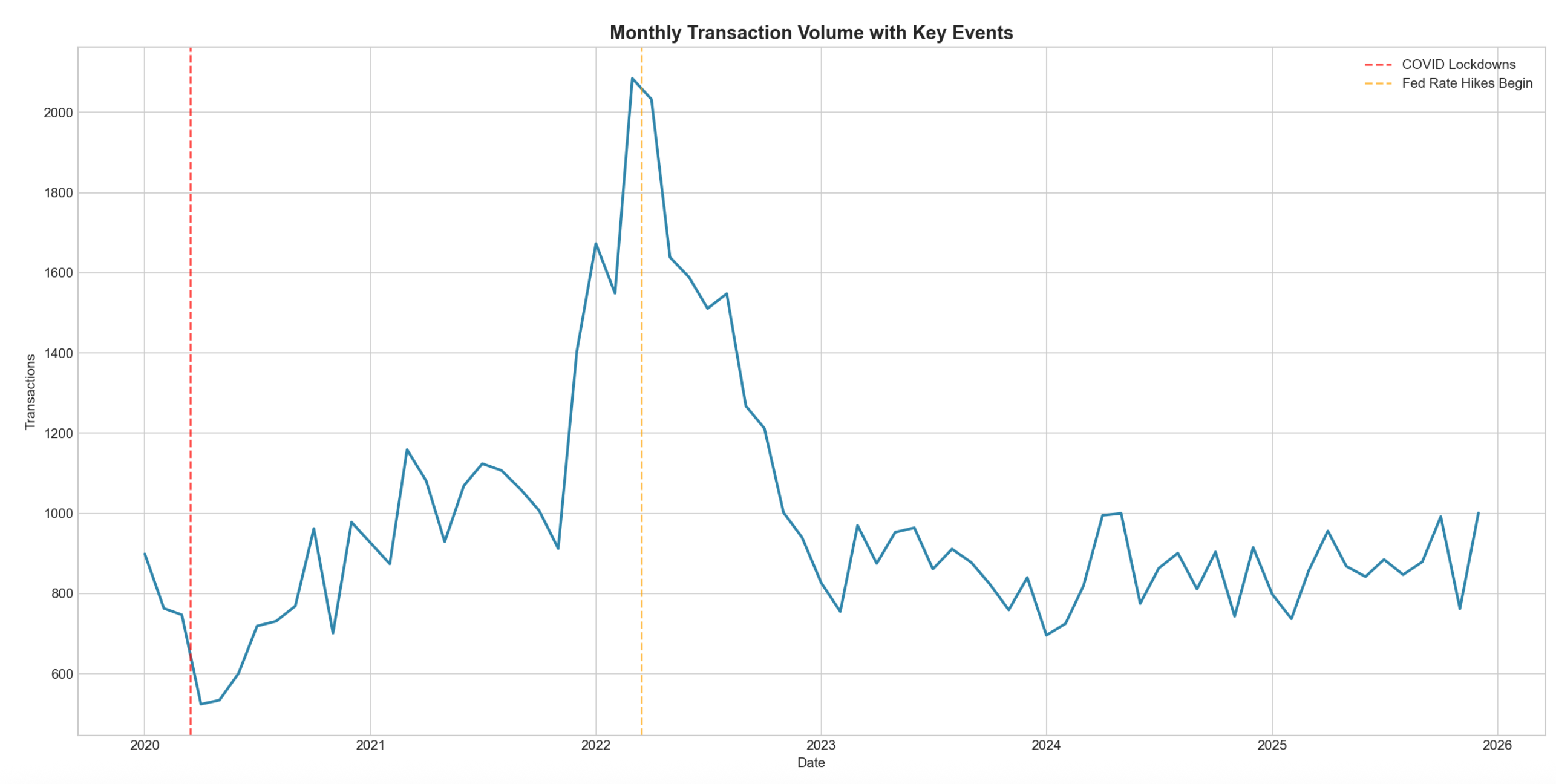 As rates fell, activity surged then tapered by late 2022, settling into a steady state of roughly 800 transactions per month over the past three years.