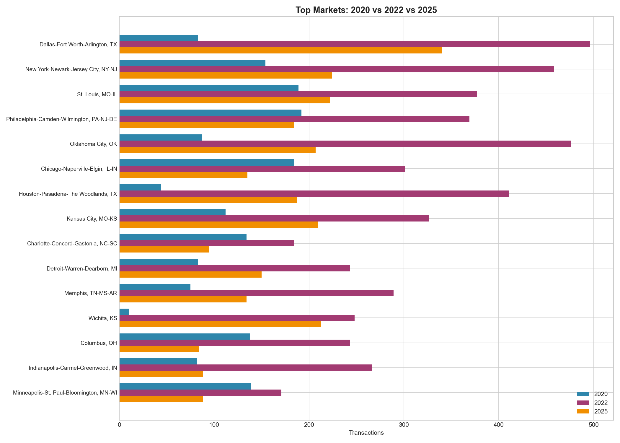 A handful of metros have seen net increases; Des Moines, Lexington, and Pittsburgh have all grown transaction counts since 2022. Other high-yield metros like Baltimore, Toledo, and Birmingham have held steady.