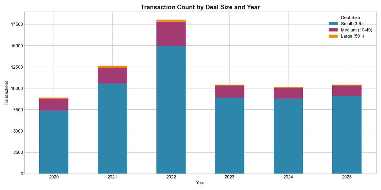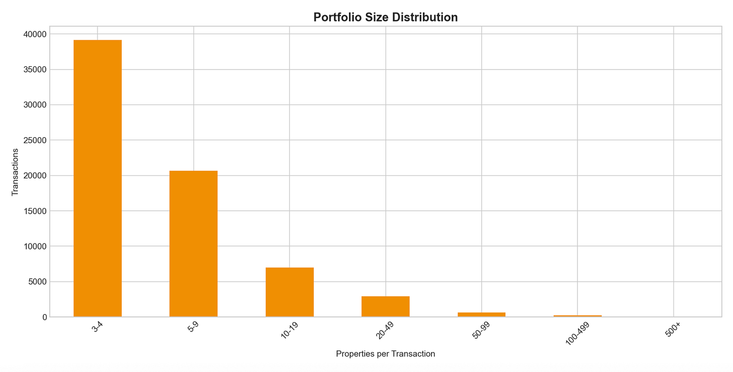 The bulk of activity is on the smaller end with portfolios of 3–9 homes accounting for 85% of transactions over the past five years.