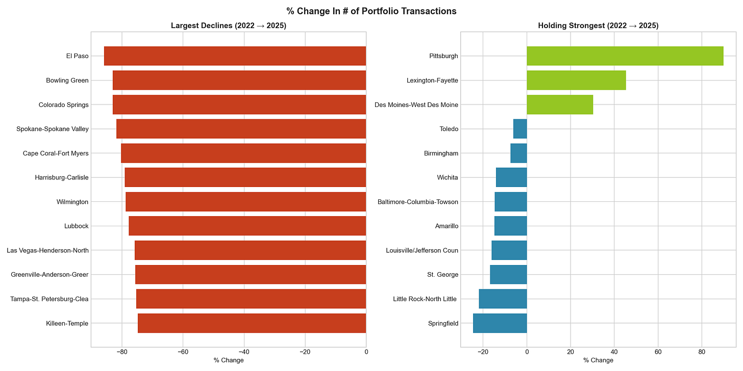 Meanwhile, hot SFR markets with low gross yields are seeing the sharpest pullbacks. Vegas, Tampa, and Cape Coral all experienced 75%+ declines in portfolio transactions from 2022 to 2025.