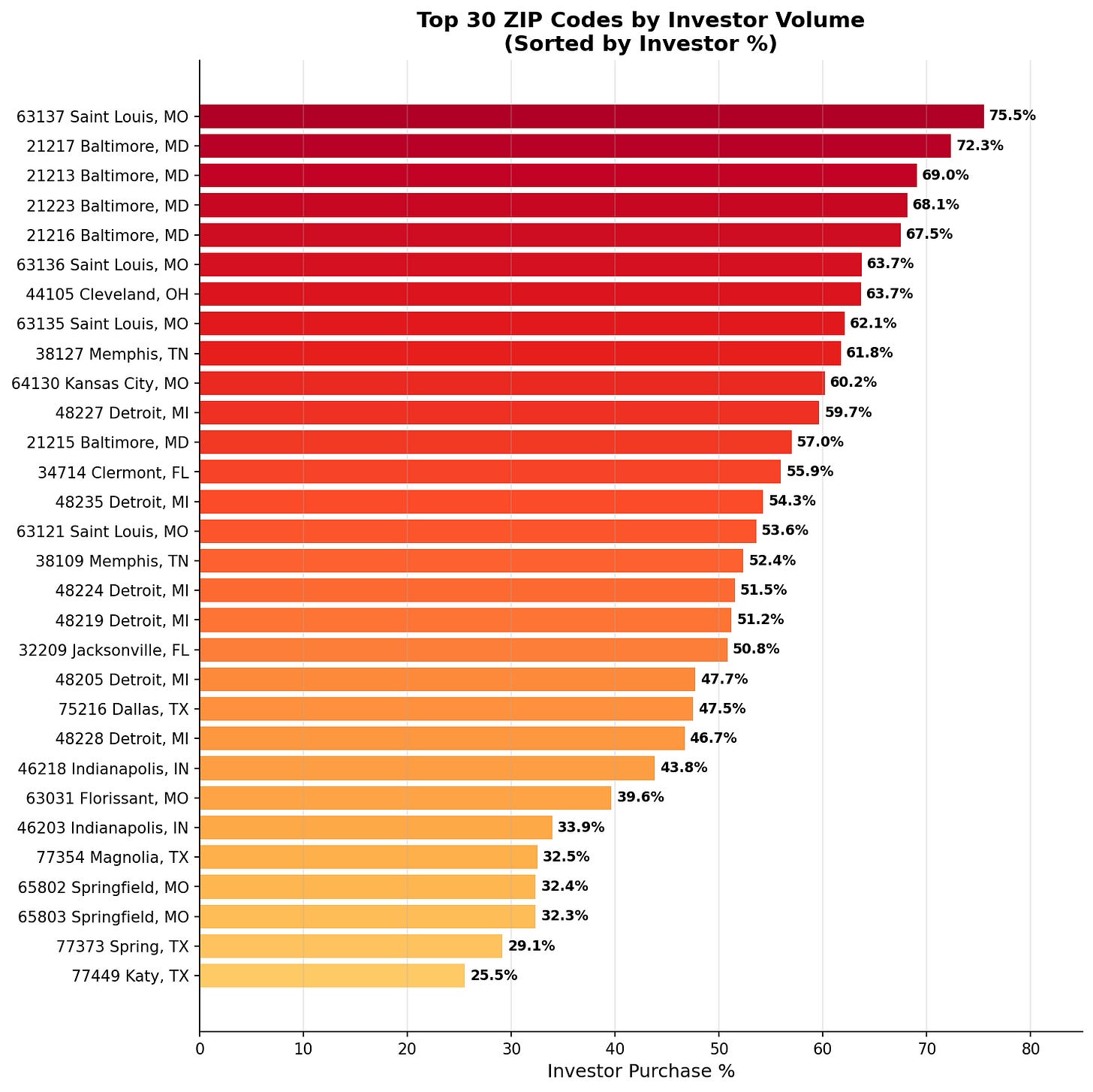 Right next door, 63137 wins on concentration: 75.5% of all purchases go to investors, the highest rate of any major ZIP. But with 598 investor purchases, it’s actually #2 by volume.