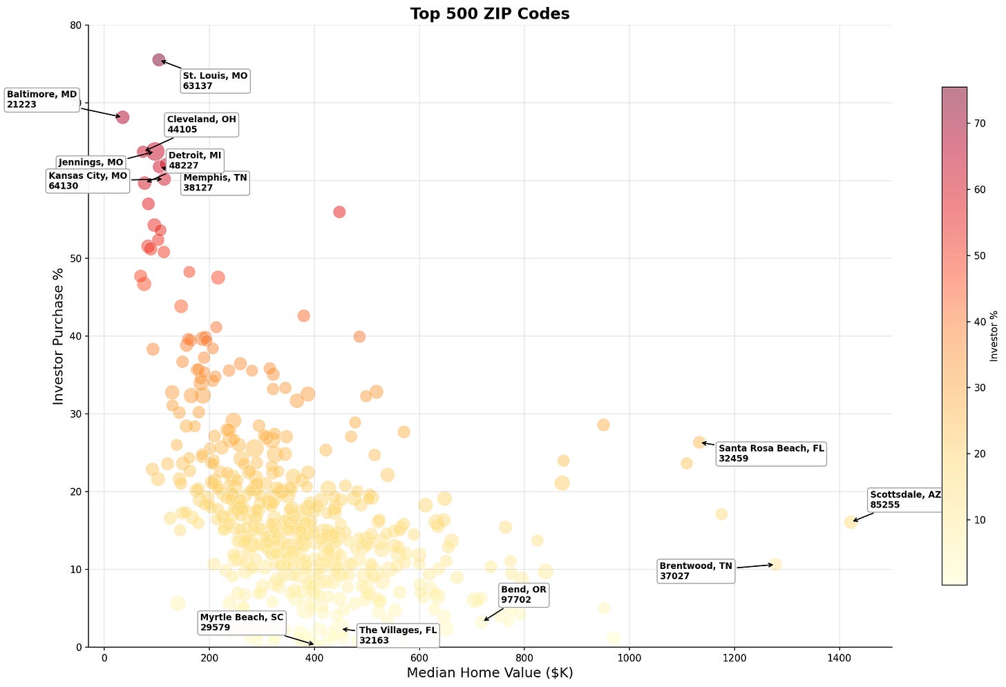 Below: the full range of median home value vs. investor purchase share.