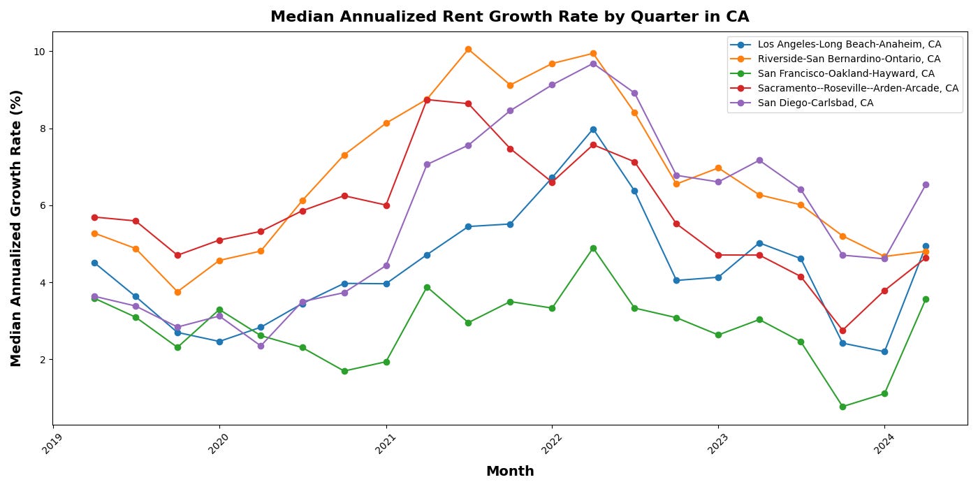 • Across California, rent growth accelerated rapidly in 2021, reaching 8%+ year-over-year in many metro areas; in 2023, that trend reversed, with rent growth slowing significantly.