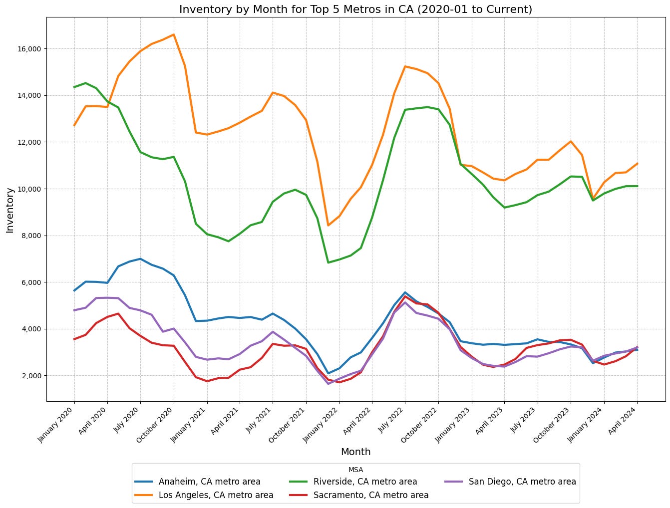 • In regions like Sacramento, San Diego, and Anaheim, current inventory sits close to January 2022 lows, while markets like Los Angeles and Riverside have more robust inventory, but still lower than pre-Covid levels.