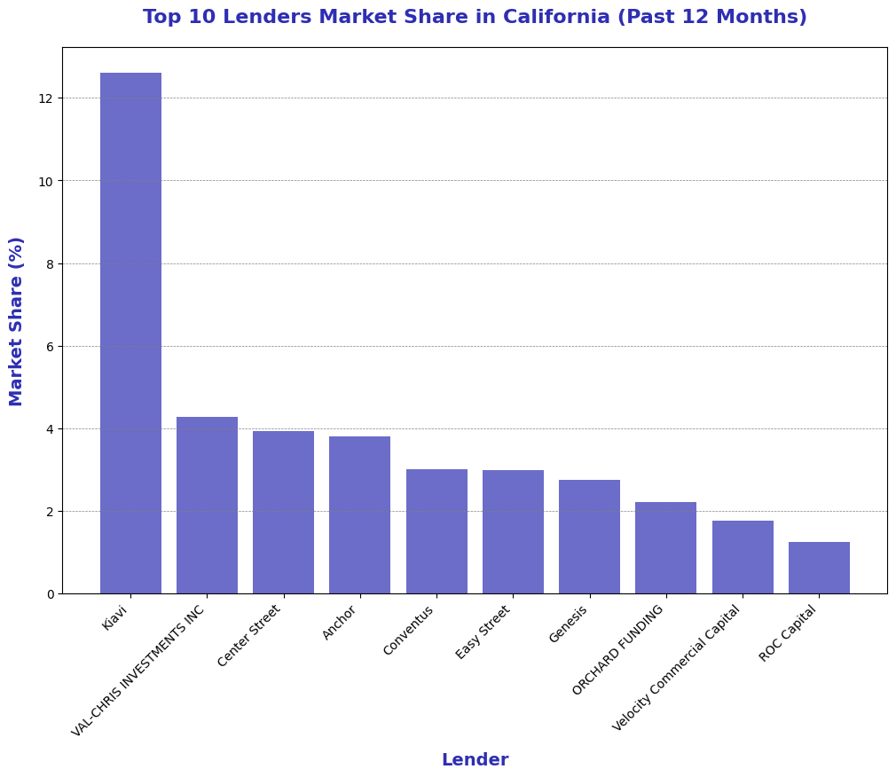 Over the past 12 months, Kiavi has had the largest market share in California by a wide margin, accounting for over 12% of private loans compared to around 4% for the handful of next closest lenders.