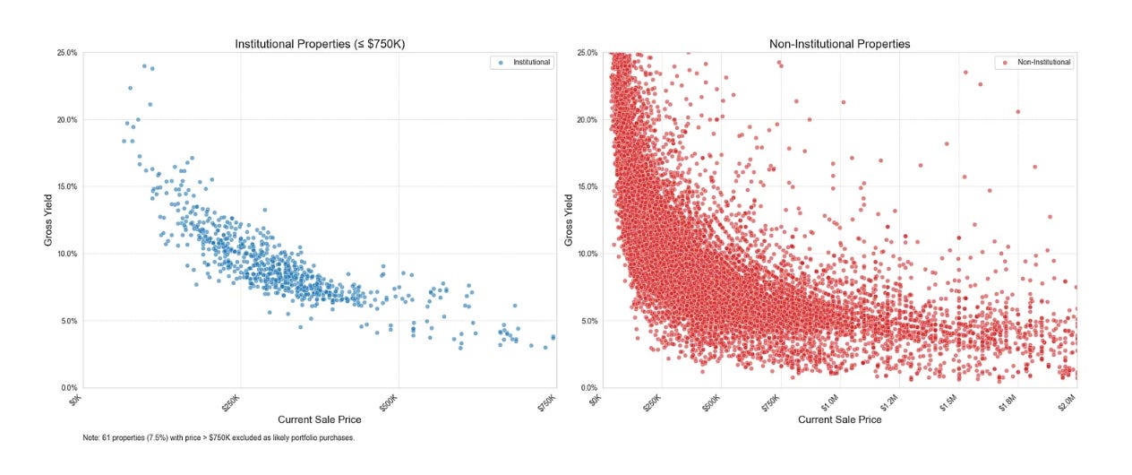 While institutional investors are primarily on the sidelines, both individuals and smaller operators are still active. Of the 30,000+ rentals we analyzed, over half of them were purchased by individuals. These individuals' strategies are highly varied - buying everything from new construction to rent out at a 4% gross yield to buying properties in D-class neighborhoods at 30%+ gross yields