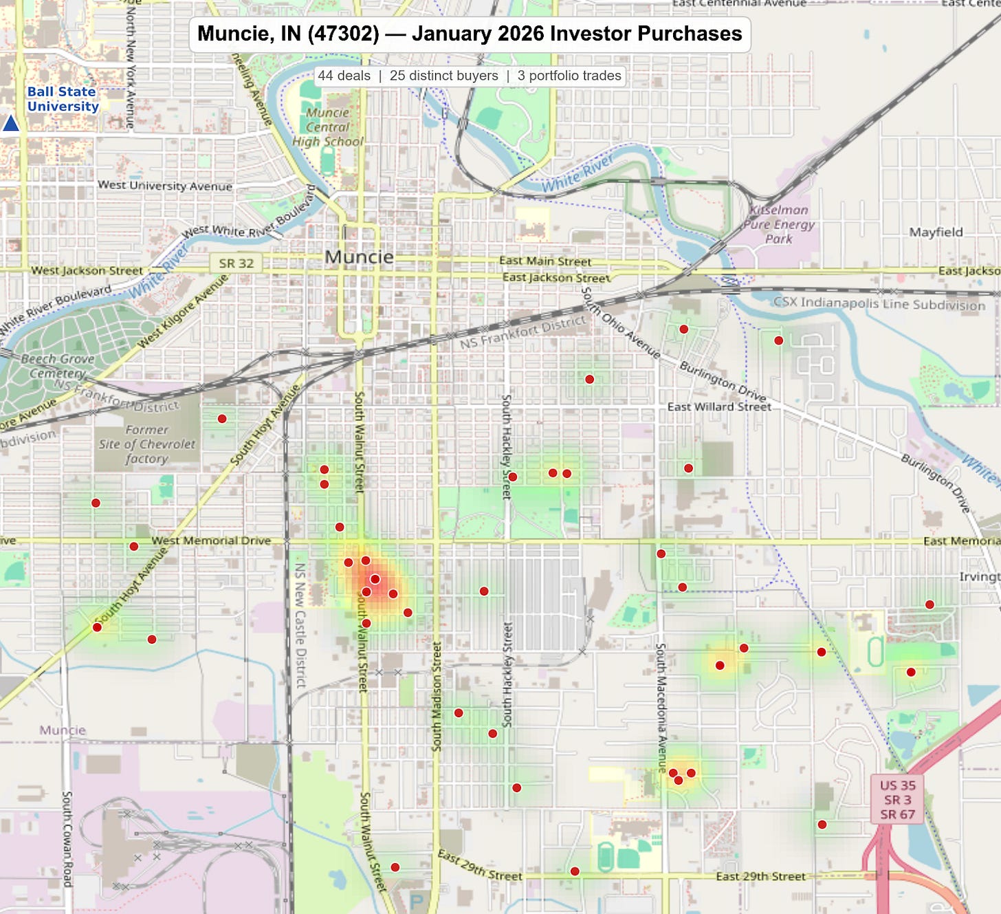 The zip code 47302 in Muncie, Indiana saw 44 investor purchases in January alone, driven by at least three distinct portfolio trades and a flurry of smaller acquisitions.