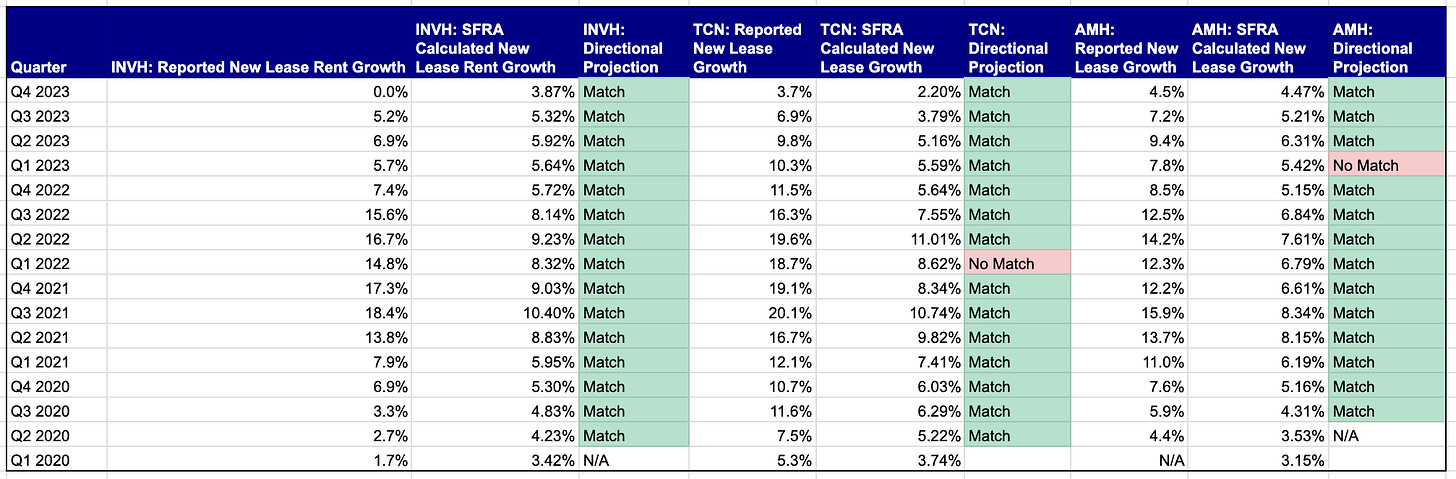 SFR Analytics has a track record of 0.95+ r-squared correlation for calculated figures compared to reported actual figures for new lease rent growth.