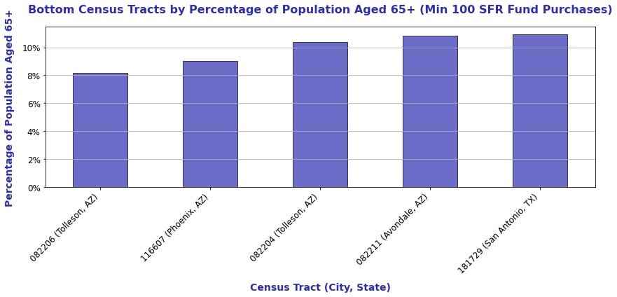 Census Tracts With Lowest Percentage of Population Aged 65+ (Min 100 Fund Purchases)