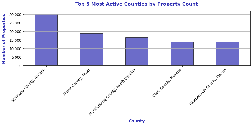 The most active counties for SFR funds by holdings are Maricopa County, Harris County, Mecklenburg County, Clark County, and Hillsborough County.