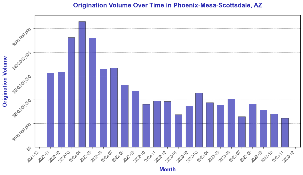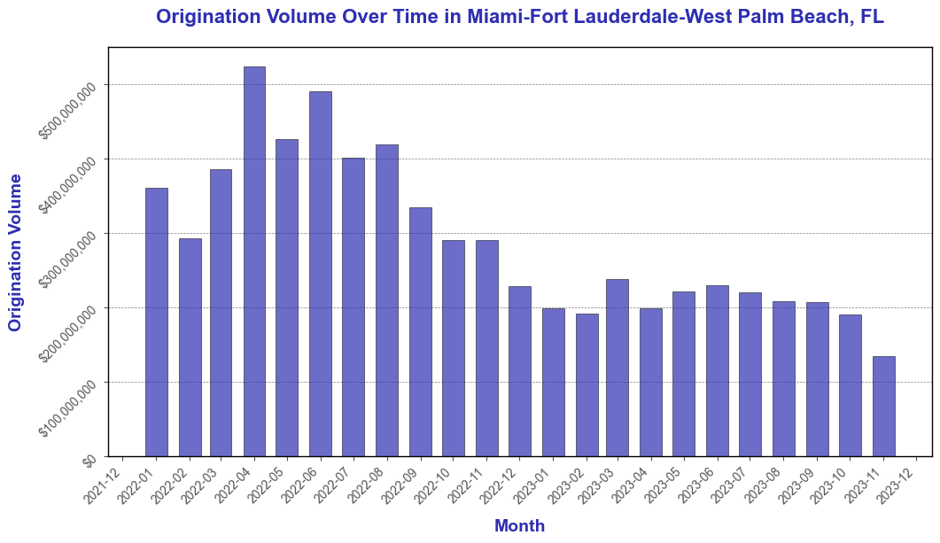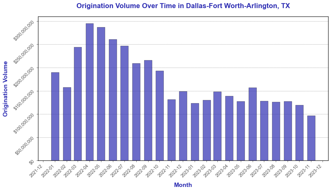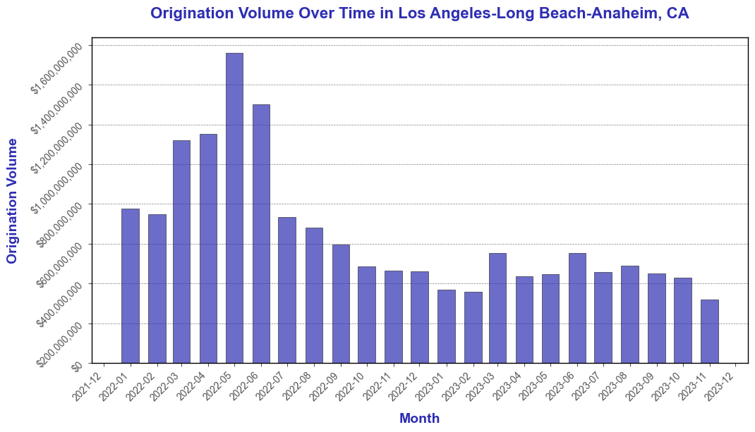The largest regions by loan origination volume were Los Angeles, New York, Miami, Phoenix, and Dallas/Fort Worth.