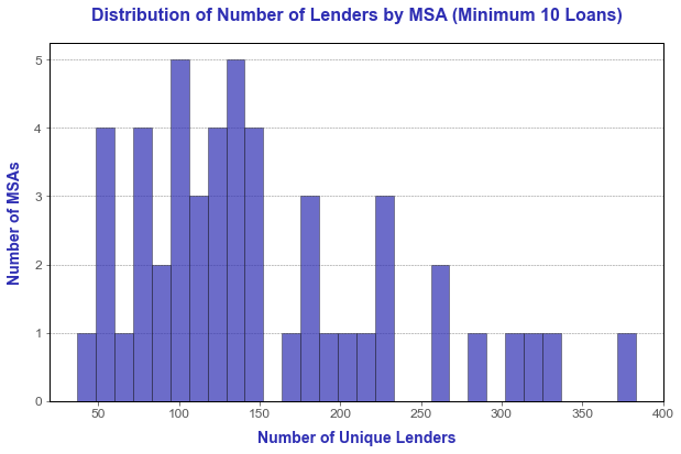 Private lending supports a long tail of active lenders within MSAs. Most MSAs had 100+ unique lenders completing 10+ loans over the period Jan 2022 to November 2023.