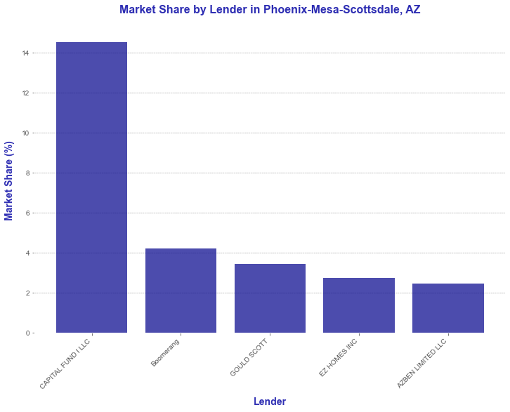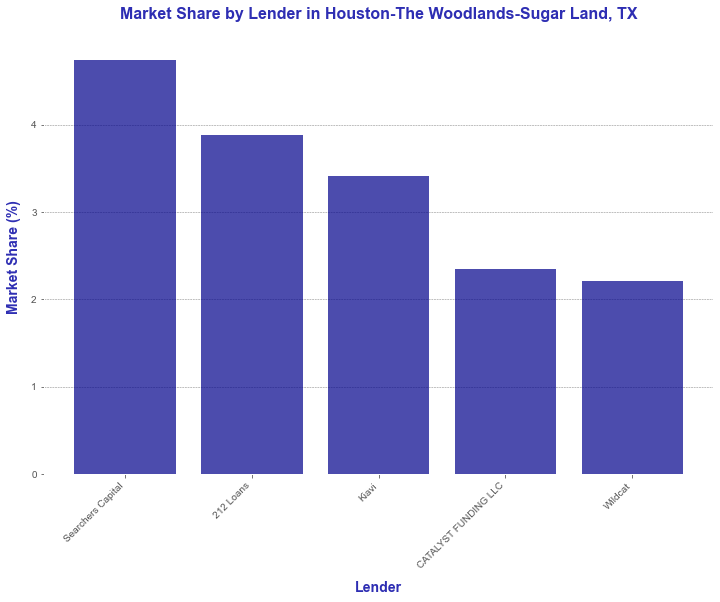In Houston, Searchers Capital has captured the top market share position, edging out 212 Loans and Kiavi with a market share of almost 5%.