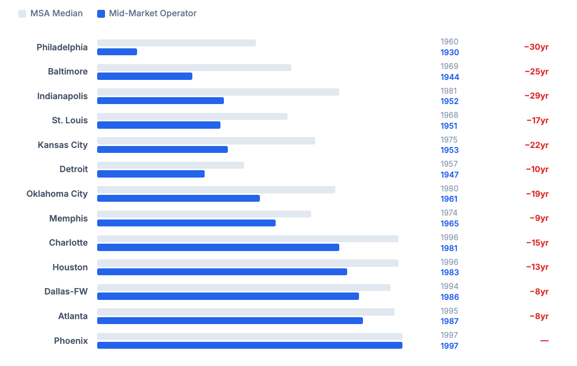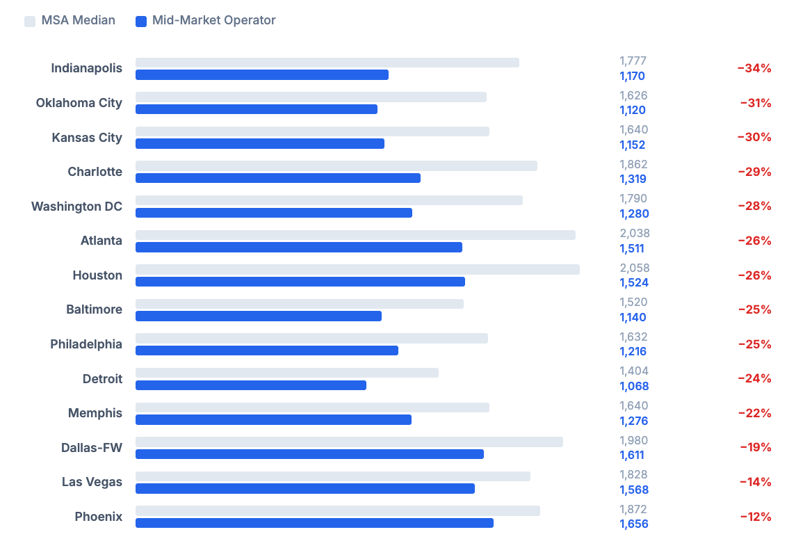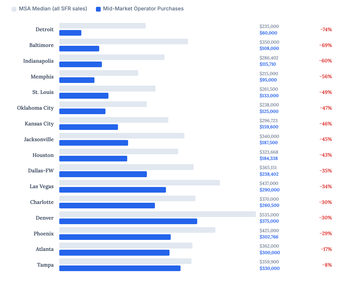 Across the most active metros for mid-market operators, they're often buying properties roughly 40% below the median sale price. This is because they're typically buying homes that need significant renovation, are in less desirable areas, and fit the workforce housing profile.