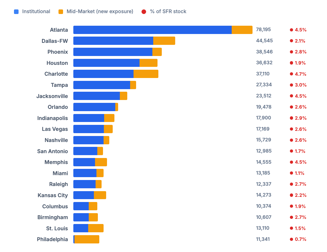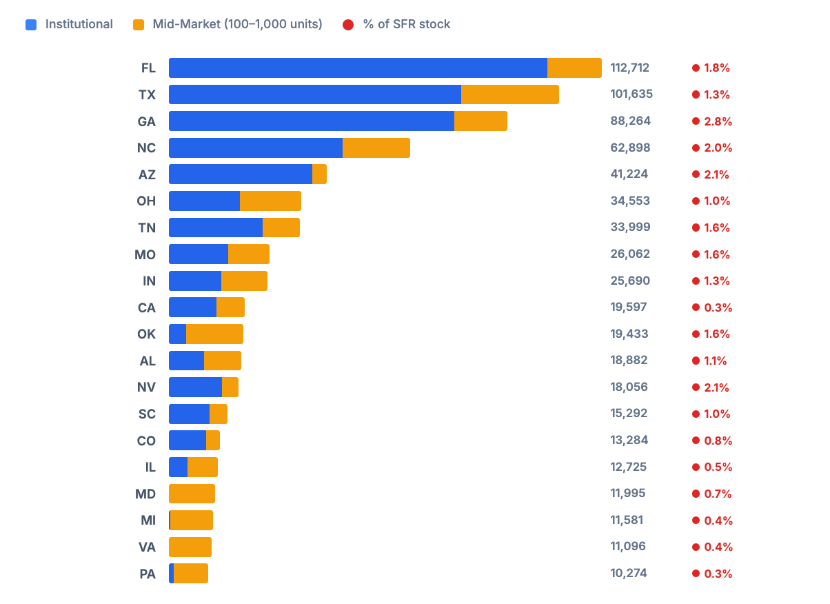 The mid-market operators alone don't add much, with less than 1% of single-family housing stock in most states owned by mid-market or institutional investors.