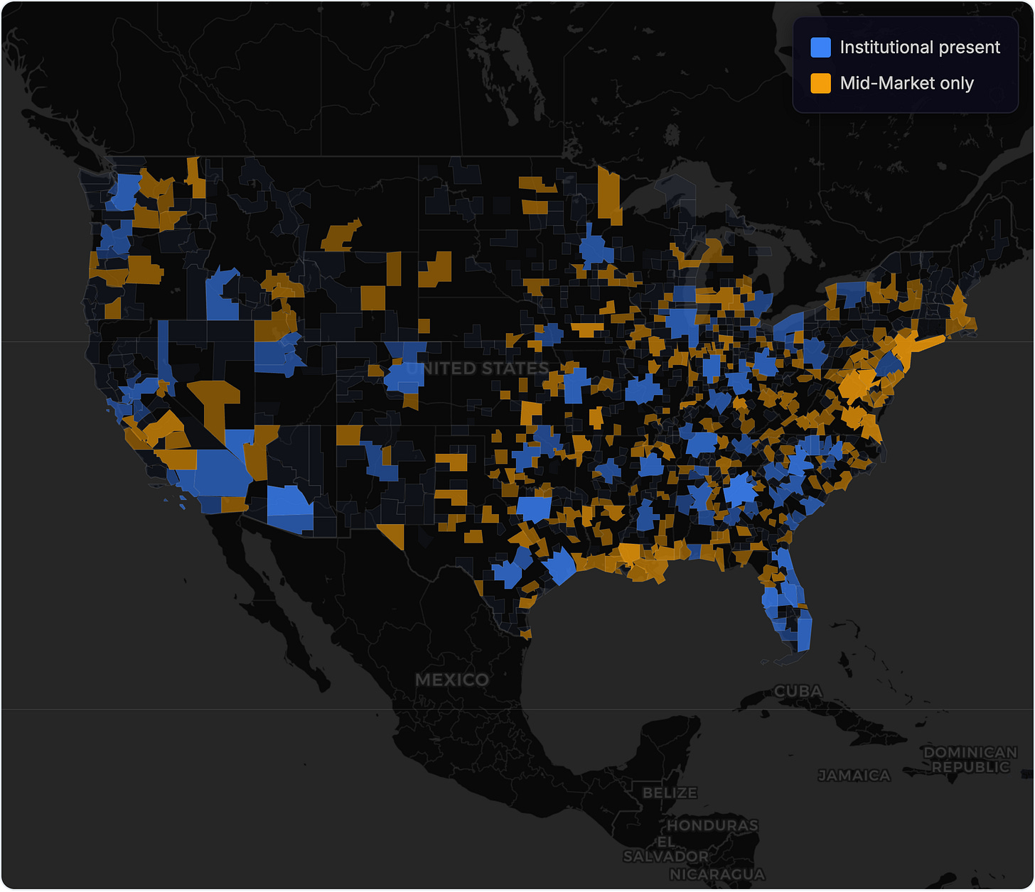 As you can see in the map above, there's a significant geographic shift in where mid-market operators (100–1,000 properties) are concentrated compared to institutional owners. Much of the Northeast rises in prominence, many tertiary markets in the Rust Belt and Southeast grow, and parts of the West Coast get added.
