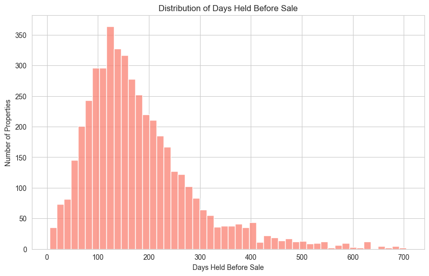 Most properties flipped by Wedgewood are held between 80 and 240 days, though a long-tail of longer duration flips exists.